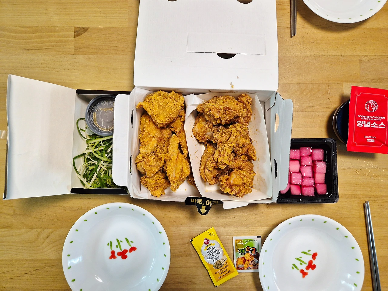 배달 치킨(프라이드, 간장 순살 반반과 파채)
