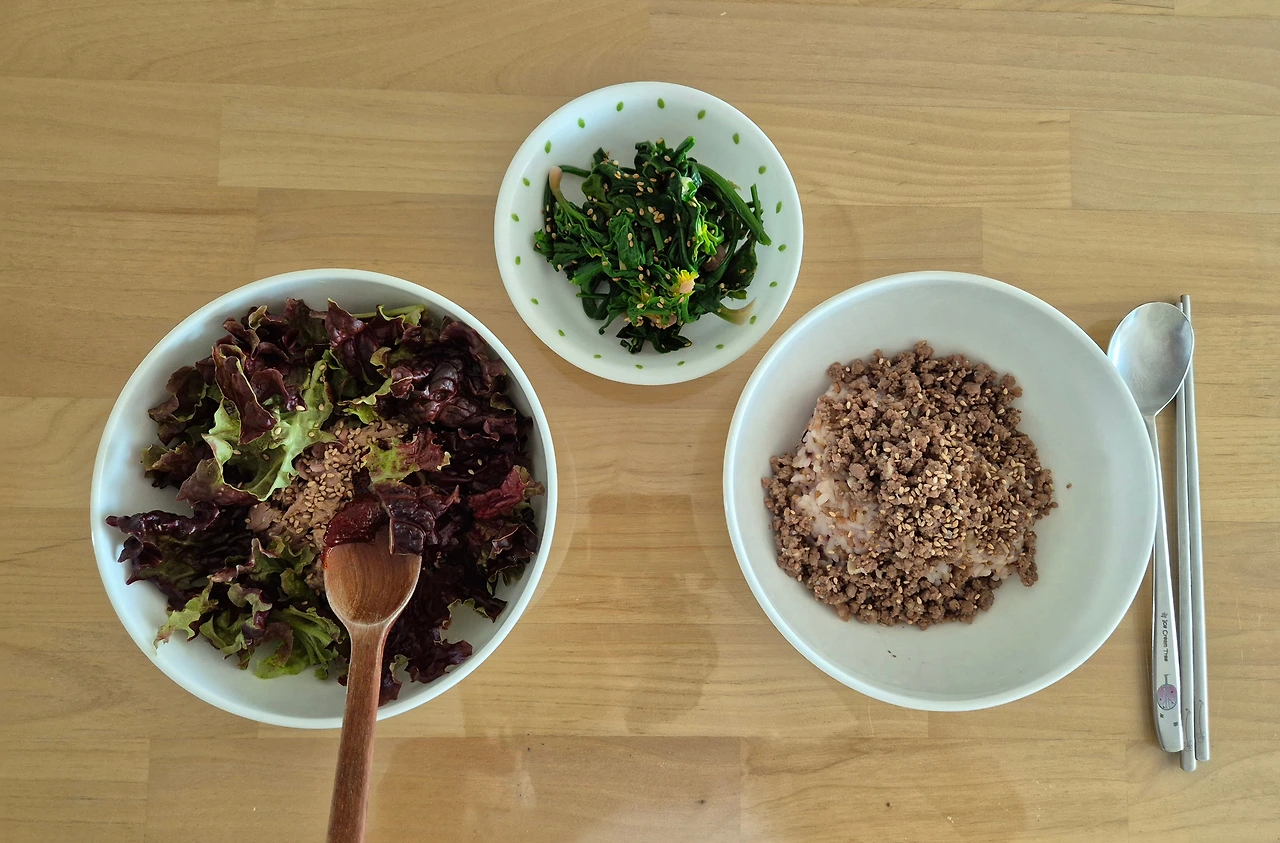 대학교 학생식당에서 자주 먹었던 기억을 떠올리며 참치와 상추로 비빔밥을 만들고