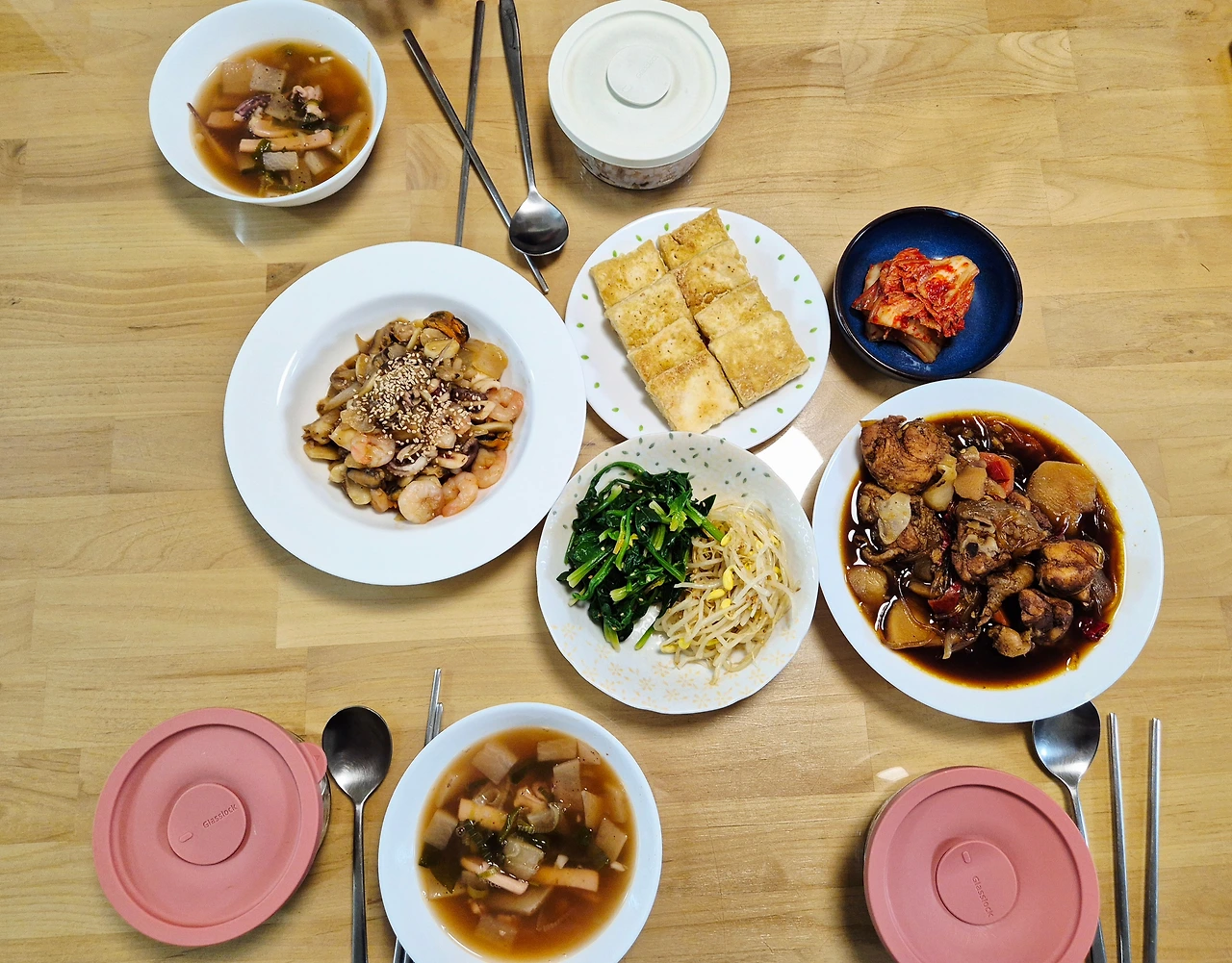 해물볶음: 얼마 전 코스트코에서 산 냉동해물을 꺼내 볶았다. 가지랑 같이 볶으면 중식 맛이 나서 여름에 자주 해 먹었었다. 가지는 없지만 양파, 버섯, 마늘 넣어 버터에 살짝 볶다가 냉동해물을 넣고 후추, 굴소스 뿌려 수분 좀 날아갈 때까지 볶으면 된다. 밥에 올려 먹으니 해물덮밥이 되었다.