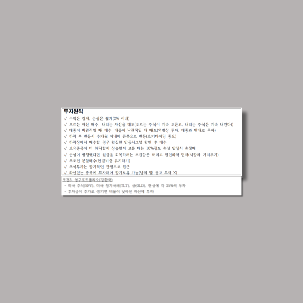 아 전략은 주식(SPY), 채권(TLT), 금(GLD), 현금에 25%씩 분산해서 투자하는 겁니다. 주식과 채권으로 상대 위험성을 헷지 하고, 안전자산인 금과 현금을 추가한 전략입니다. 주식이나 채권이 많이 떨어졌다고 판단되면 현금 일부를 투입하는 것도 좋은 방법입니다. 투자자금이 추가로 생겼다면 비율에 맞춰서 해당 종목을 매수하면 됩니다.