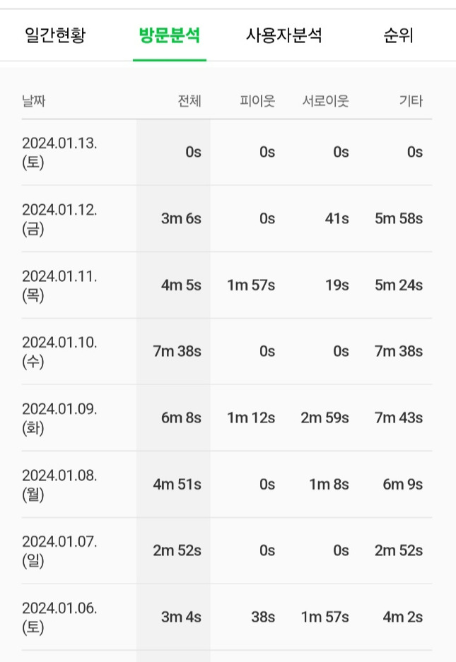 위 사진을 보면 차이를 확실하게 느낄 수 있으시겠죠? 서로이웃보다 검색유입자(기타)가 제 블로그에 오래 머무릅니다. 무리하게 서로 이웃을 늘리는데 시간을 소비할 필요가 없다는 거예요. 그 시간에 차라리 게시글을 한 개라도 더 작성하세요.