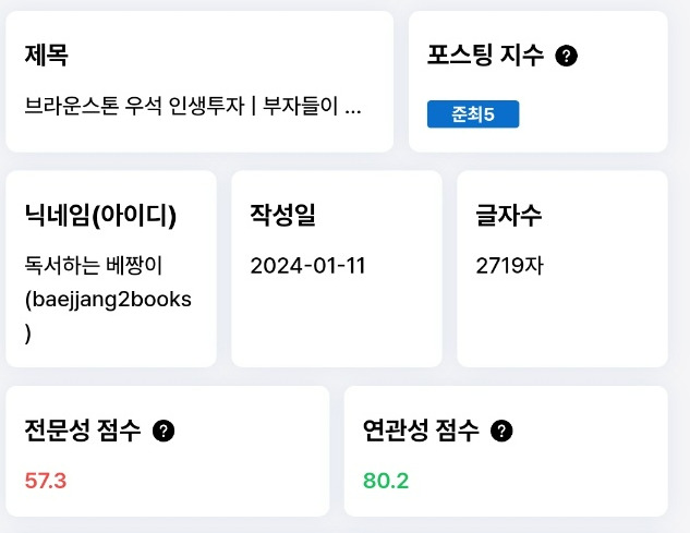 위 사진은 제 게시글 포스팅 지수인데요. '전문성 점수' 그리고 '연관성 점수'가 보이시죠? 이 점수를 기준으로 지수가 산정됩니다.