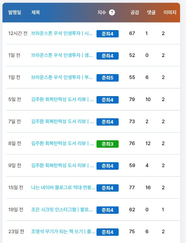 이때부터 변화가 보이기 시작했어요. 포스팅 지수가 준최 3~준최 4가 나오기 시작하더라고요. 그리고 어제 기존에 지수가 낮았던 게시글이 전체적으로 한 단계씩 지수가 상승했어요.