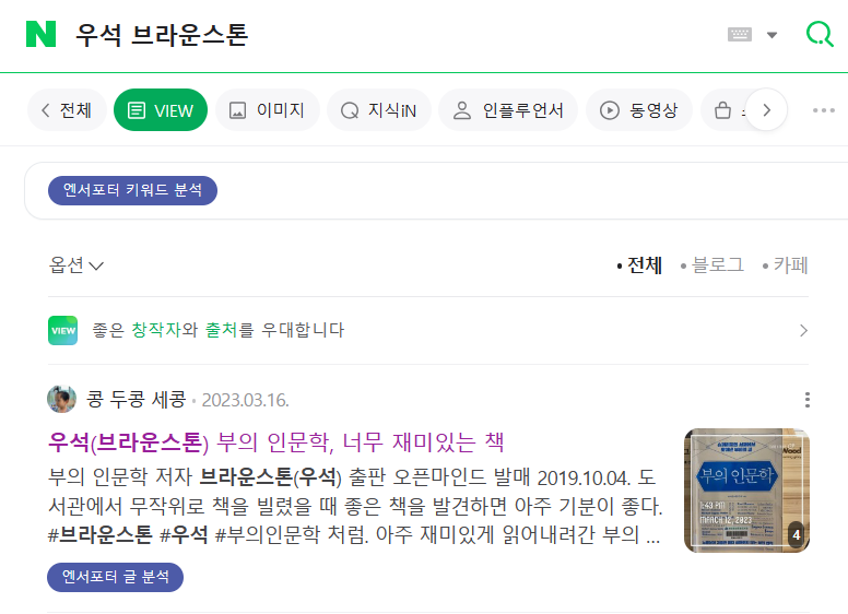 이 문제에 대한 답을 찾기 위해 '우석 브라운스톤'으로 검색해 보았습니다. 뷰 탭 최상단에는 '콩 두콩 세콩'님께서 작성한 게시글이 올라와 있는 걸 보실 수 있죠?