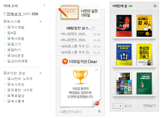 저는 책 읽는 습관을 들이고 싶어서 매일 책을 읽고 블로그에 글을 썼습니다. 그리고 100일 미션에 도전했습니다. 네이버 블로그에서는 진행하는 다양한 챌린지 프로그램이 꾸준한 습관을 길러주는데 많은 도움이 됩니다.