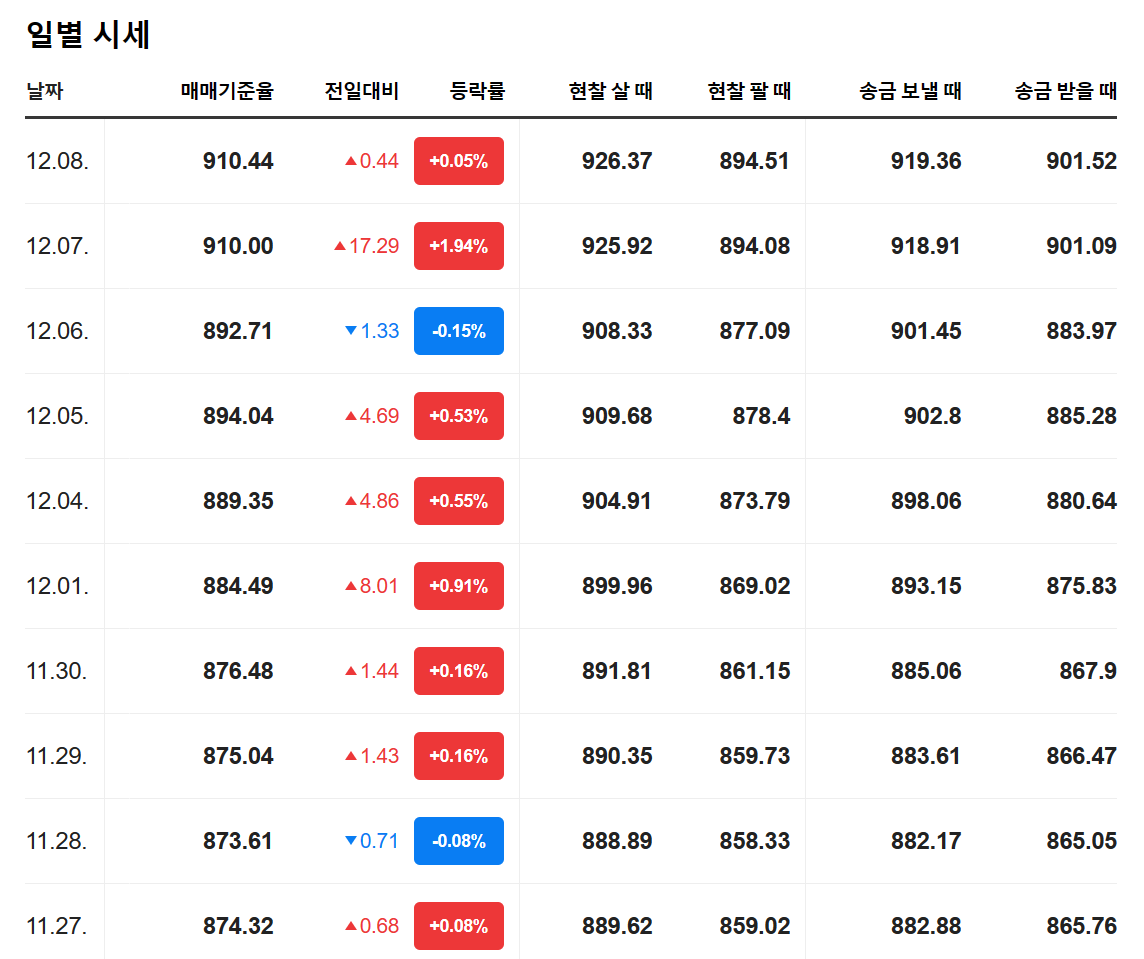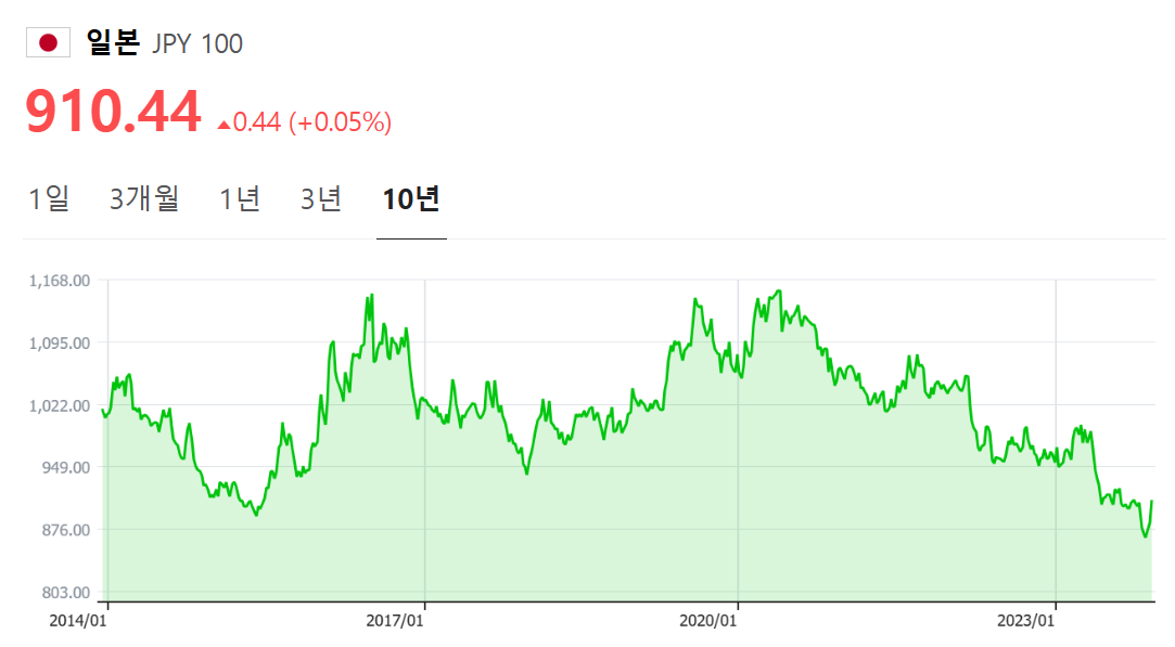 오늘 엔화 가격을 볼게요. 100엔당 880원입니다. 858원까지 내려갔었네요. 조금 올랐지만 그래도 10년 내 가장 낮은 저점입니다. 달리 말하면 투자하기 가장 좋은 시점이라는 뜻도 되겠죠?