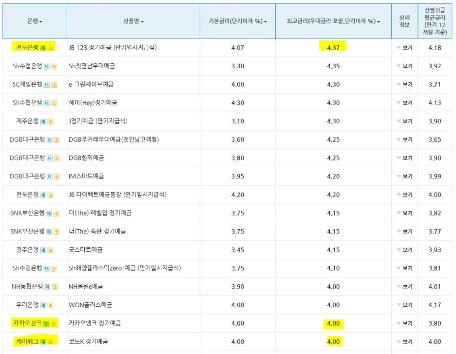 왜일까요? 그건 바로 높은 예금금리 때문입니다. 현재 기준 우리나라 시중은행 예금금리 평균은 3.9%입니다. 전북은행 같은 경우에는 4.37%까지 주네요. 우리가 많이 사용하는 케이뱅크나 카카오뱅크 같은 인터넷 은행도 4%입니다.