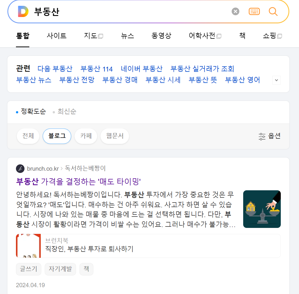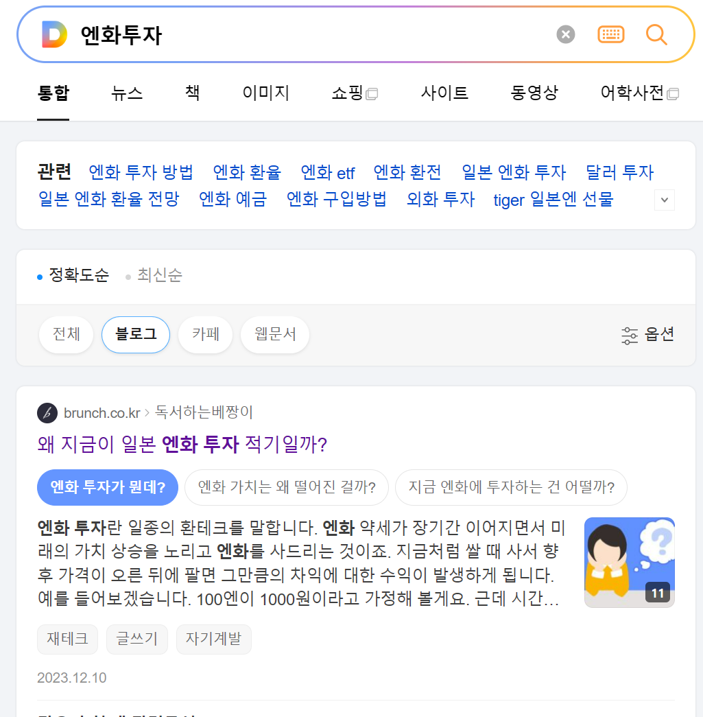 '부동산', '브런치작가', '엔화투자'와 같은 키워드로도 상위 노출이 되고 있어요. 브런치를 시작한 지 얼마 안 되어도, 글쓰기를 자주 하지 않더라도 얼마든지 상위에 노출되는 게 가능합니다.