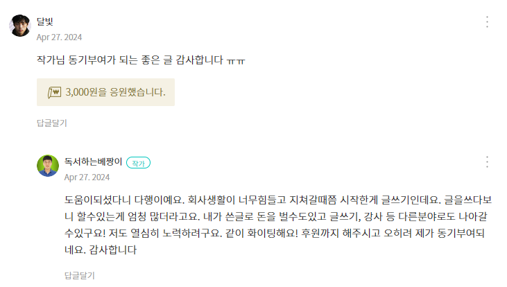 브런치 글쓰기에 지쳐가고 목적의식을 상실할 때쯤 응원댓글을 보고 다시 힘이 나더라고요! 내 글이 누군가에게 도움이 된다는 사실이 저를 다시 글 쓰게 만들었습니다.