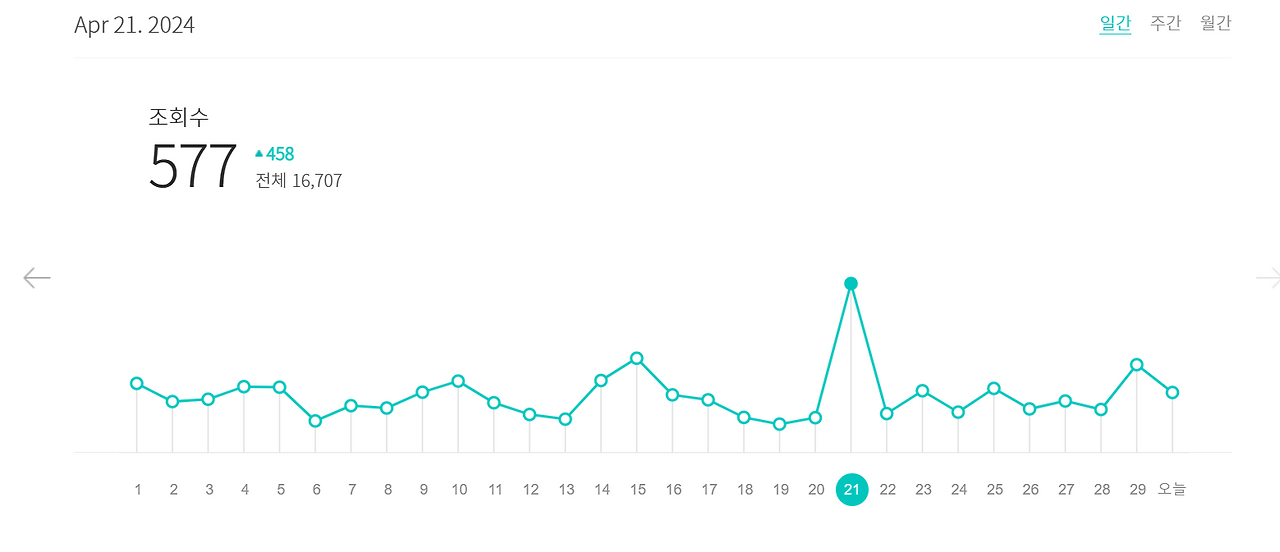 조회수도 확실한 차이가 발생합니다. 글을 쓰지 않아도 100 이상의 조회수가 나오고 글을 쓰는 날에는 500 이상의 조회수도 발생합니다. 블로그에서는 한 번도 경험해 보지 못한 일이었어요.