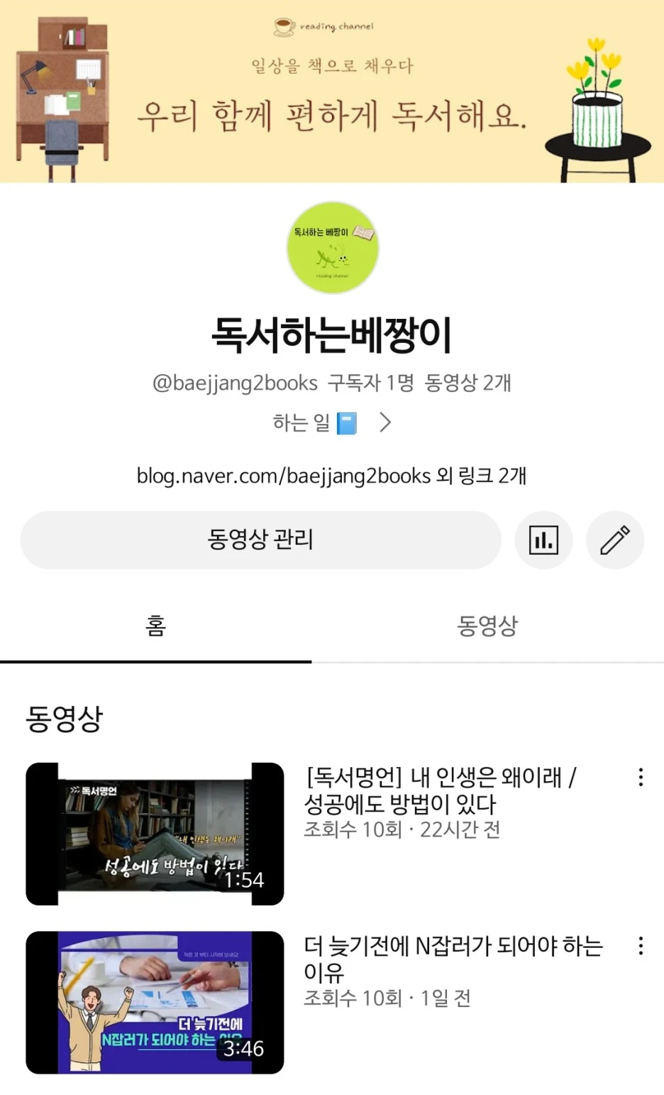 마지막으로 유튜브입니다. 이제 시작한지 3일 되었네요. 아직 구독자가 1명뿐인 완전 초보 유튜버입니다. 사실 유튜브는 지금 시작할 생각은 없었어요. 다른 건 시작하면 뭔가 결과가 나오는데 유튜브는 아니라고 생각했거든요. 영상을 편집하는 것에 대한 두려움이 있었던 것 같아요.