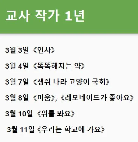 매일 글 쓰는 작가, 매일 책 읽어주는 교사 "매일"이란 단어를 좋아하게 되었습니다. 제 책이 조금 다른 인생을 생각하는 독자에게 닿기를 바라며 오늘도 책에 쓴 대로 작가로서의 공언을 지키는 모습 이어가겠습니다. 월요일 아침 어떤 그림책으로 아이들을 활기차게 해 줄지 생각 중입니다. 《선생님은 몬스터》로 8일째 되는 월요일 교사와 학생 사이 신학기 어색함이 줄어들었으면, 더 가까워지면 좋겠습니다.