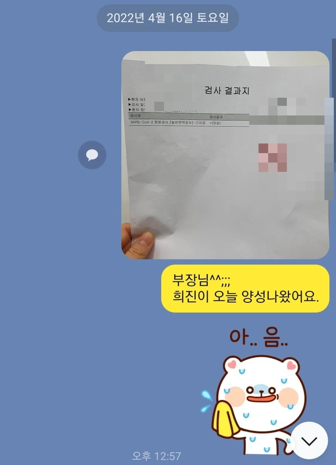 집에 와보니 희진이는 열이 여전히 있고 방에 마스크를 쓰고 있다. 친구와 통화하느라 바쁜 눈치다. 희진이 양성 확인서를 읽어보았다. 담임선생님께 지금 연락해야 할지 월요일 아침에 연락해야 할지 조금 고민이 되었다. 카톡을 보냈다.