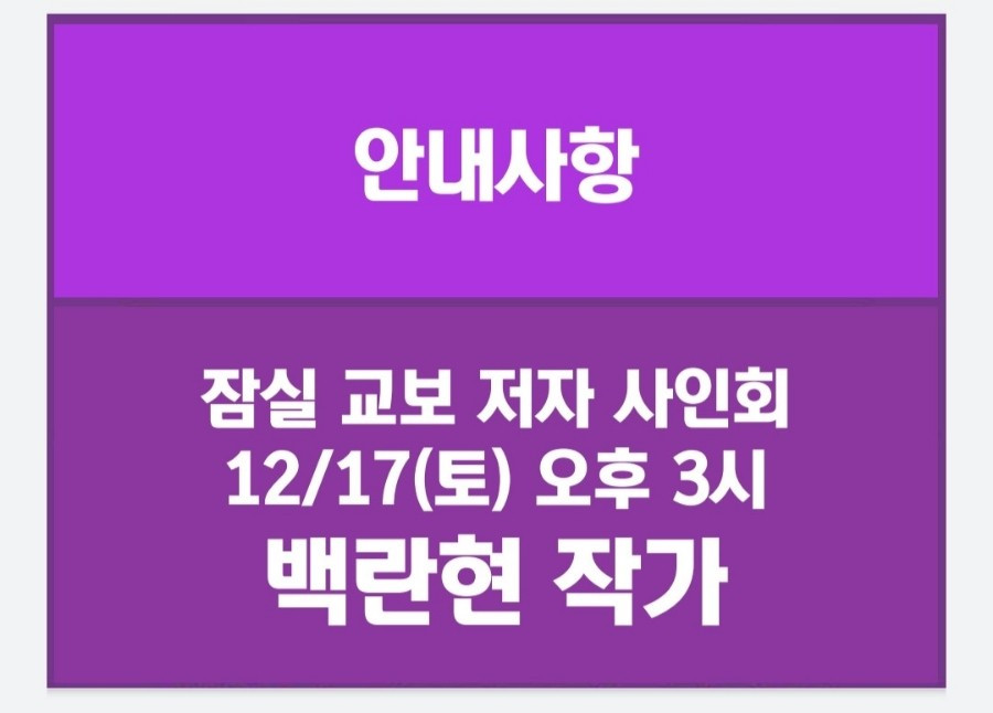 12월 잠실 교보 저자 사인회 신청서 12월 잠실교보 저자 사인회 주인공은 백란현 작가님입니다. 많은 분들 오셔서 응원과 격려 해주시길 부탁드립니다. . 아래 신청서 작성 후 제출해주시면 됩니다. 정상 접수된 경우, 본인 이메일
