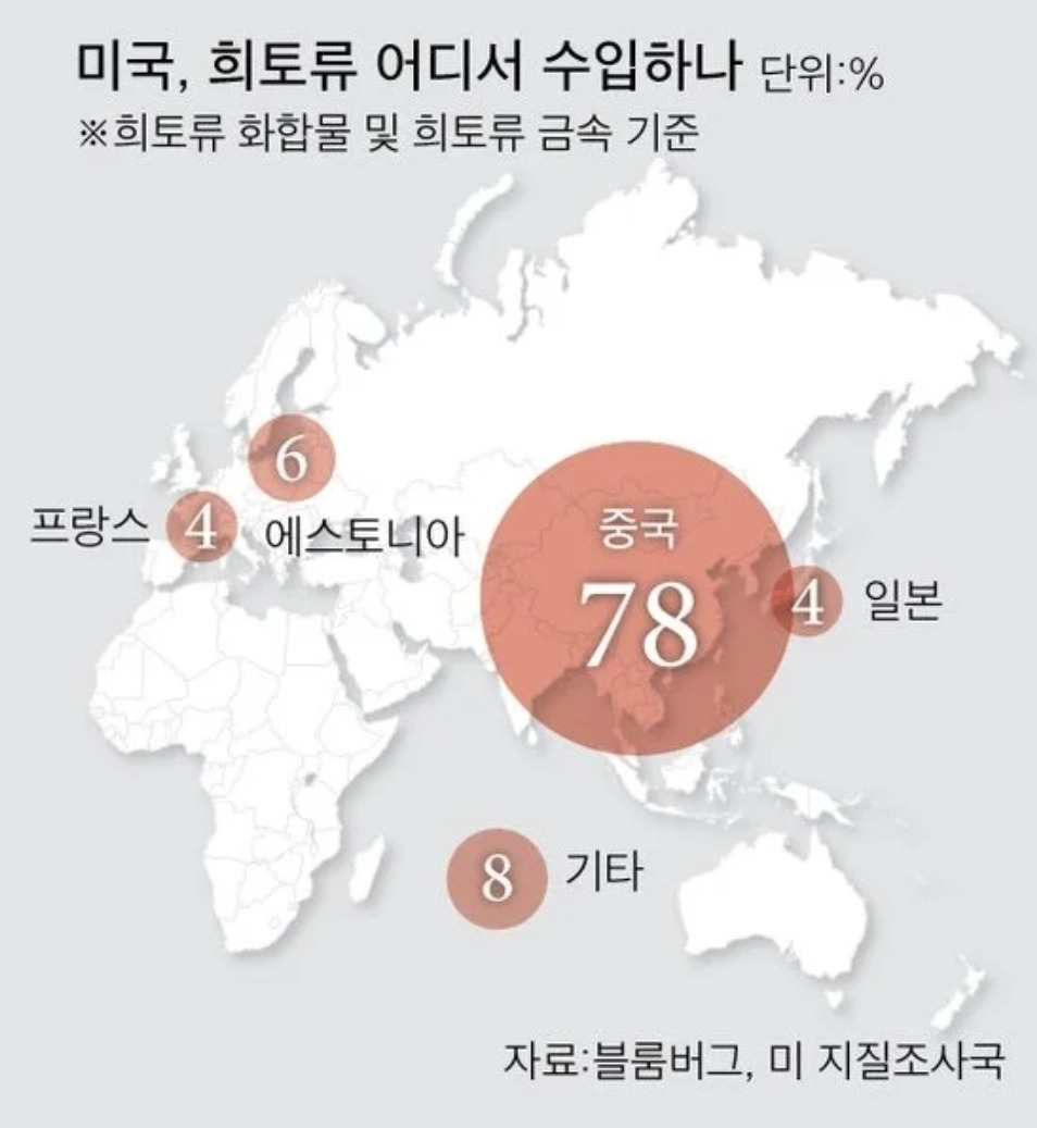 아무튼 중국은 과거에 이미 희토류를 바탕으로외교에서 우위를 가진 경험을 갖고 있기 때문에 미중 무역전쟁에서 희토류를 카드로 꺼내 들었다. 위의 사진을 보면 알다시피 미국은 중국에서 80% 가까이 희토류를 수입하고 있어서 의존도가 높은 상황이다.
