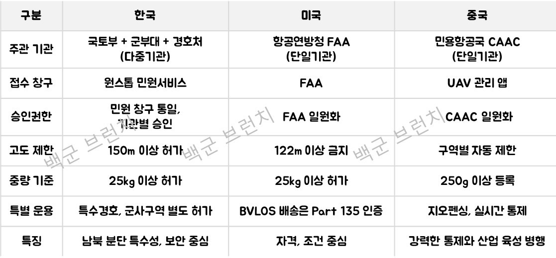사실 이렇게 복잡한 구조가 만들어진 것은 남북 분단국, 휴전국이라는 특수성이 있다. 그래서 다른 나라는 이러한데 우리나라는 왜 이런가에 대해서는 이러한 지역적 특수성을 고려해서 봐줬으면 한다. 군사보안이 절대적으로 중요한 환경에서 하늘을 나는 기체는 위협으로 간주된다. 실제로 기사들을 보면 북한의 무인기가 우리나라에 들어왔다는 본 적이 있을 것이다. 드론의 촬영 기능이나 비행 범위가 군사시설이나 경호구역과 겹칠 가능성이 농후하기 때문에, 군과 경호기관이 직접 관여하는 구조가 생겨난 것이다.