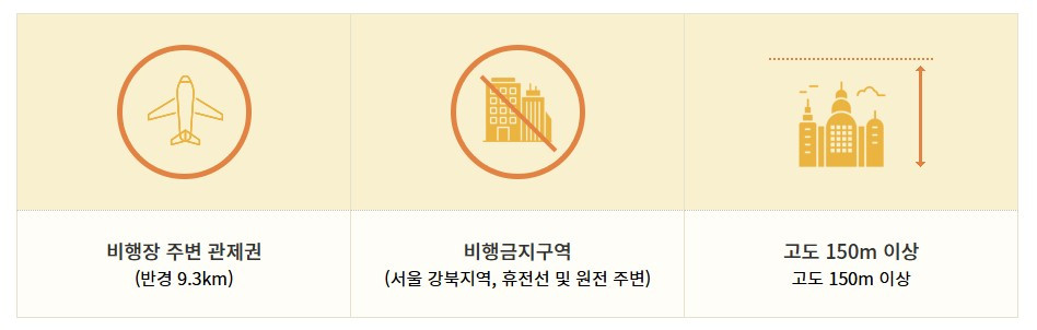 쉽게 이야기하자면 서울에서 드론을 띄우려면 국토교통부의 허가뿐만 아니라 수도방위사령부나 대통령 경호처까지 별도의 승인을 받아야 하는 경우가 있다. 인천 송도 같은 경우에는 인천공항 관제권에 걸려있어서 허가가 쉽지 않다.