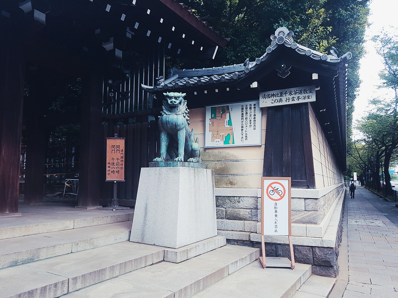 야스쿠니 신사 도착. 당시 한국에 포켓몬고가 출시되기 전이어서 오기 전에 스마트폰에 다운로드하여서 하면서 걷다 보니 어느덧 야스쿠니 신사에 도착했다. 입구부터 무언가 일본스럽다는 느낌이 드는 건축물 양식이 마음에 들었다.