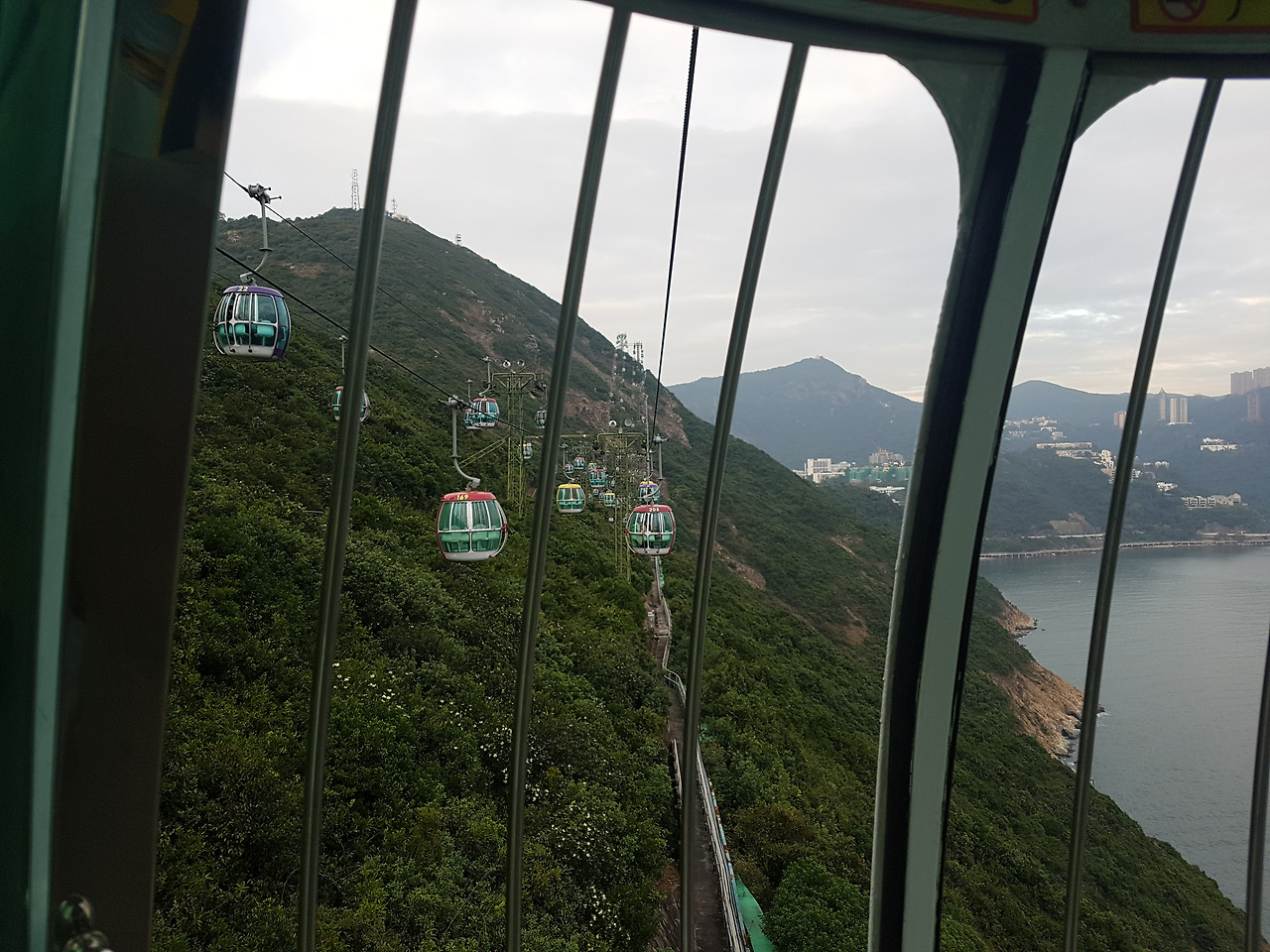 홍콩 오션파크 꼭대기에서는 해양열차나 이렇게 케이블카?를 탈 수 있는데 내려올 때는 케이블 카를 따라왔다. 절벽 위를 줄 하나만으로 가는 게 무섭다는 생각에 풍경은 많이 즐기지는 못했지만, 이런 걸 좋아하는 사람은 해가 질 무렵에 타는 것도 나쁘지 않은 것 같다.