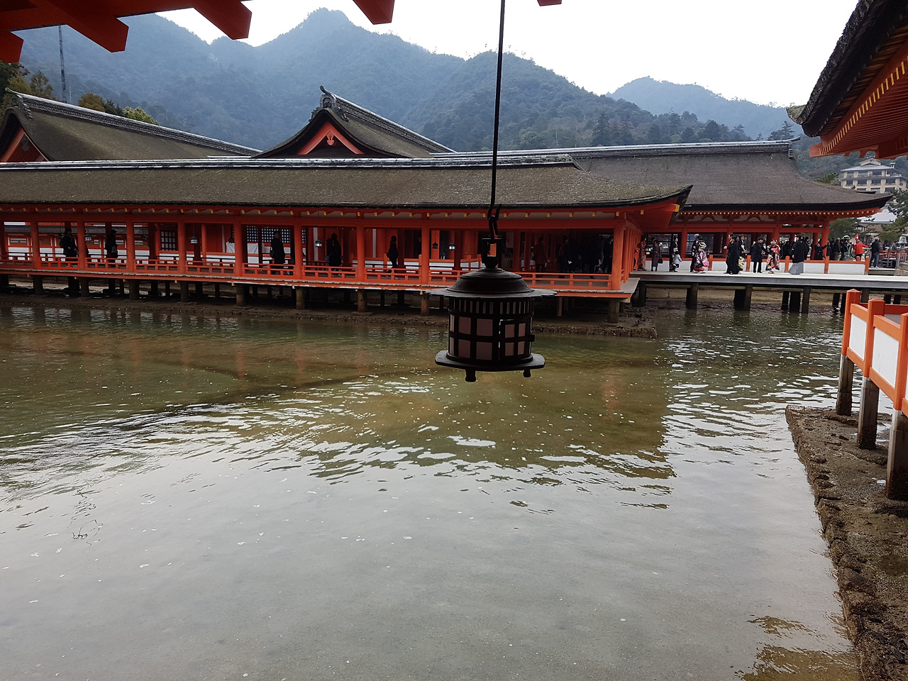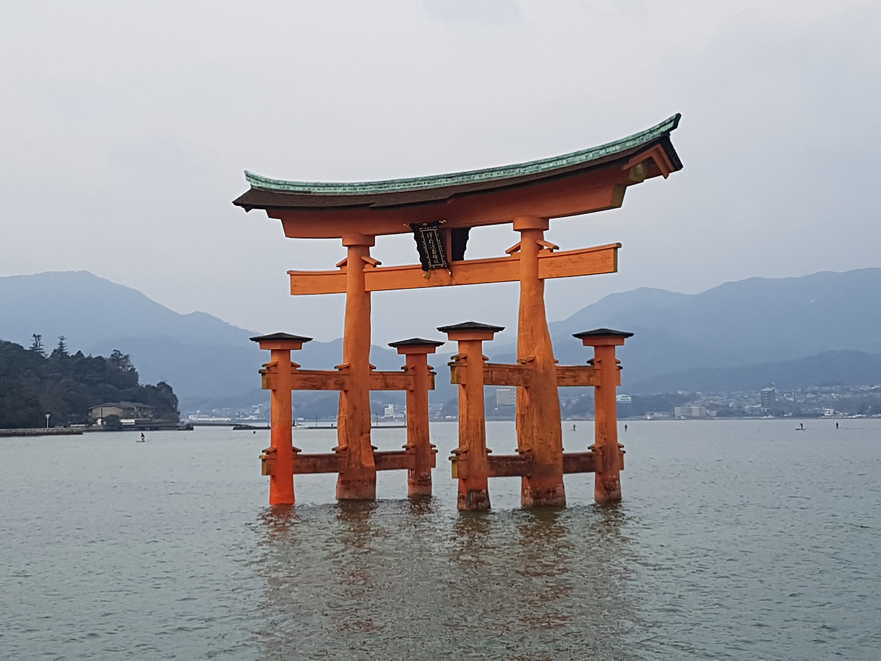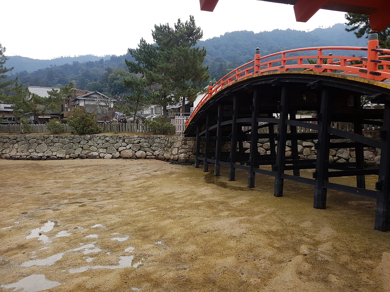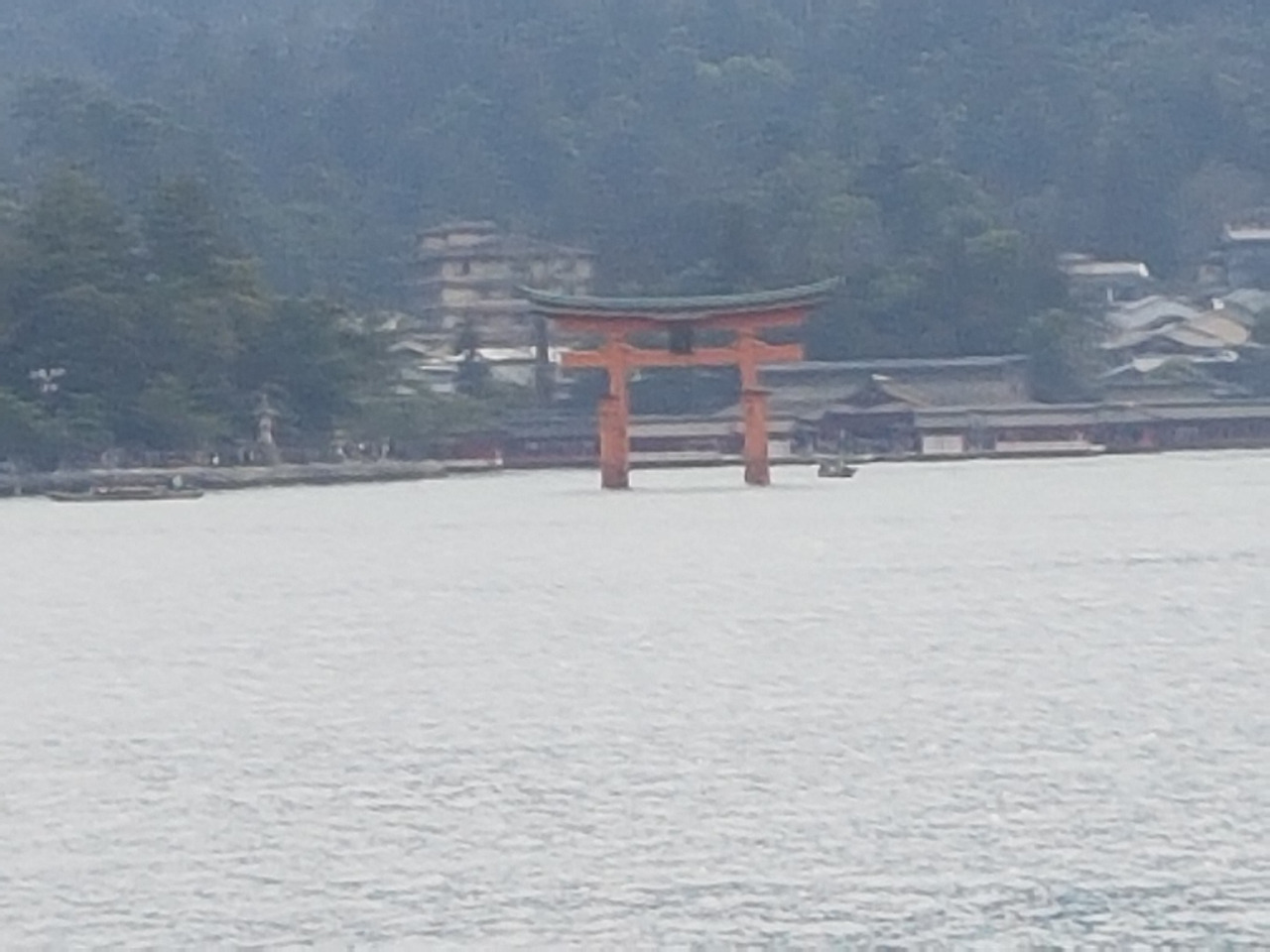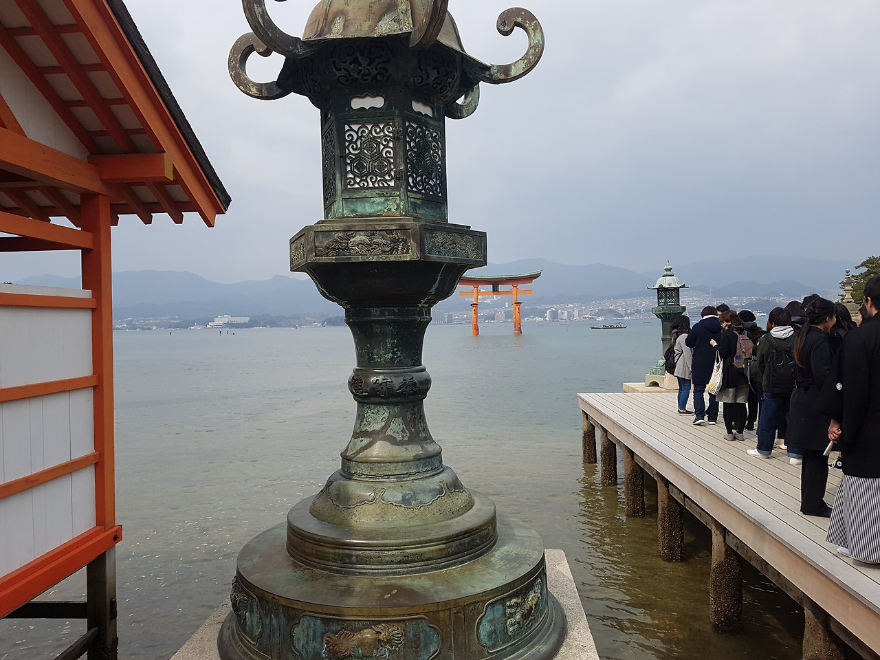 나중에 미야지마를 떠날 때쯤에는 썰물 때였는지 사람들이 저 밑을 걸어 다니고 있었다. 바다 위에 있는 빨간색 도리이 그 자체로 인상 깊었다.