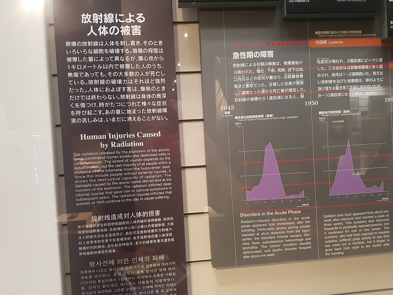 방사선에 의한 인체의 피해라는 내용인데. 원폭을 통해서 나오는 방사선은 인체 속으로 침부를 해서 여러 가지 세포를 파괴한다고 한다. 얼마나 피폭이 되었는가에 따라서 손상은 다르지만, 상처가 없는데도 피폭지 1킬로미터 안에 있는 사람들은 대부분 사망했다고 한다. 혹시나 피폭을 당하고 살아남았다고 하더라도. 그 이후에 있는 후유증 들은 상당 했다고 한다.