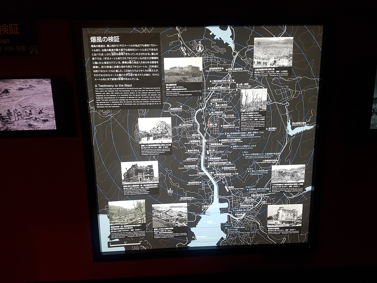자료관의 전시물들을 보니 핵폭탄이 떨어진 후의 모습들이 상상이 가기 시작했다. 갑자기 번쩍 하더니 땅이 흔들리고, 낙하 중심지로부터 반경 1km 지역에 초당 170m의 아주 강력한 속도로 폭풍이 휩쓸고 지나갔다고 한다. 보통 초대형 자연 태풍들이 초당 80m 정도라고 하니 핵폭탄이 떨어진 후 발생한 폭풍이 얼마나 강력한지 예상이 갈 것으로 생각이 된다. 폭풍이 근처를 휩쓸면서 1평방미터에 6.7~10톤과 맞먹는 압력이 주어지면서 주변의 건물들이 날아가거나 부서져갔다. 또한 이는 단순히 폭풍이 분 것뿐만 아니라, 열선이나 방사선 등이 추가적으로 나오면서 살아있는 지옥으로 점차적으로 변해갔다.