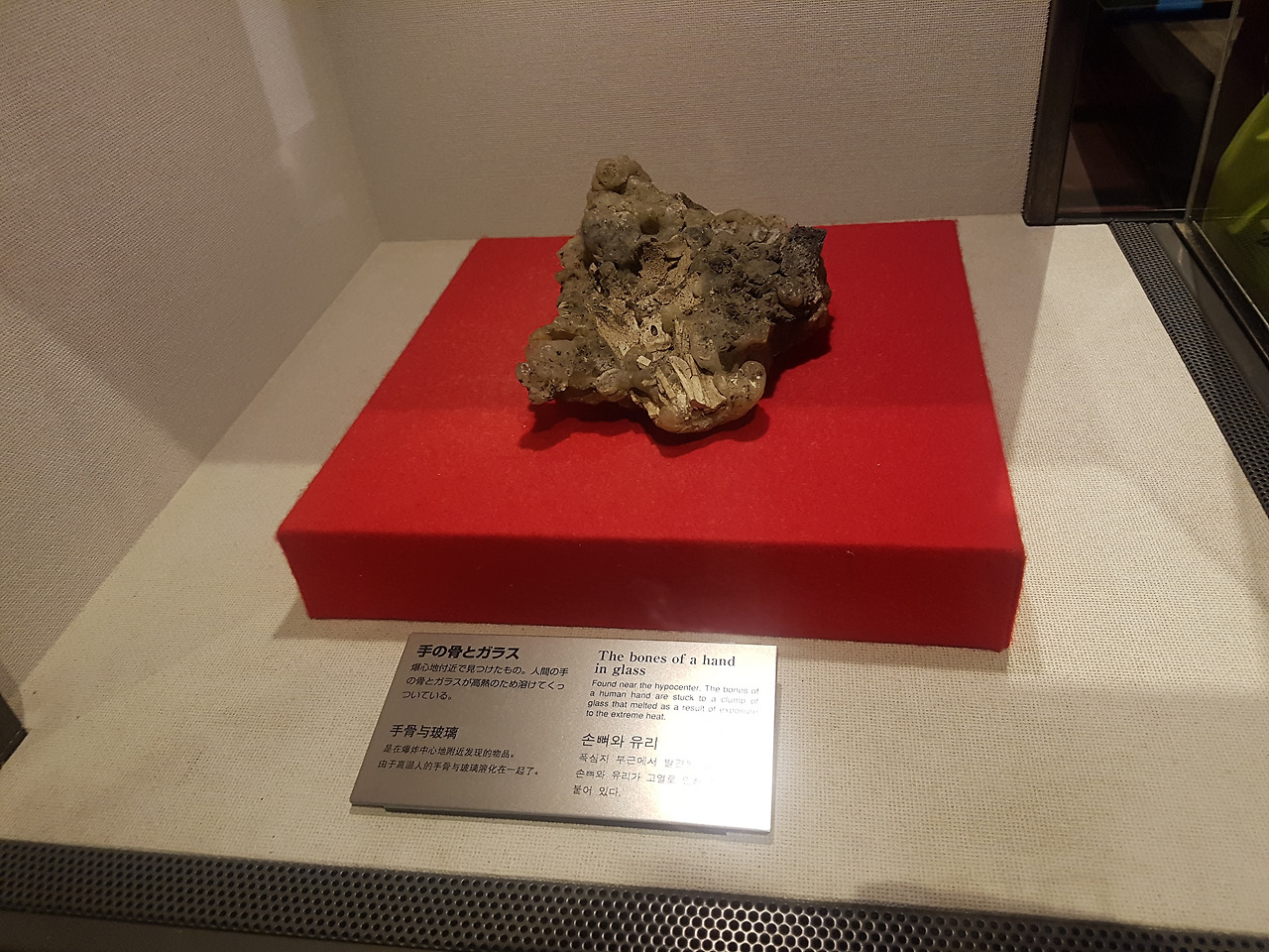 손뼈와 유리라는 전시물. 폭심지 부근에서 발견된 것으로 손뼈와 유리가 같이 녹아있는 것을 볼 수 있다.