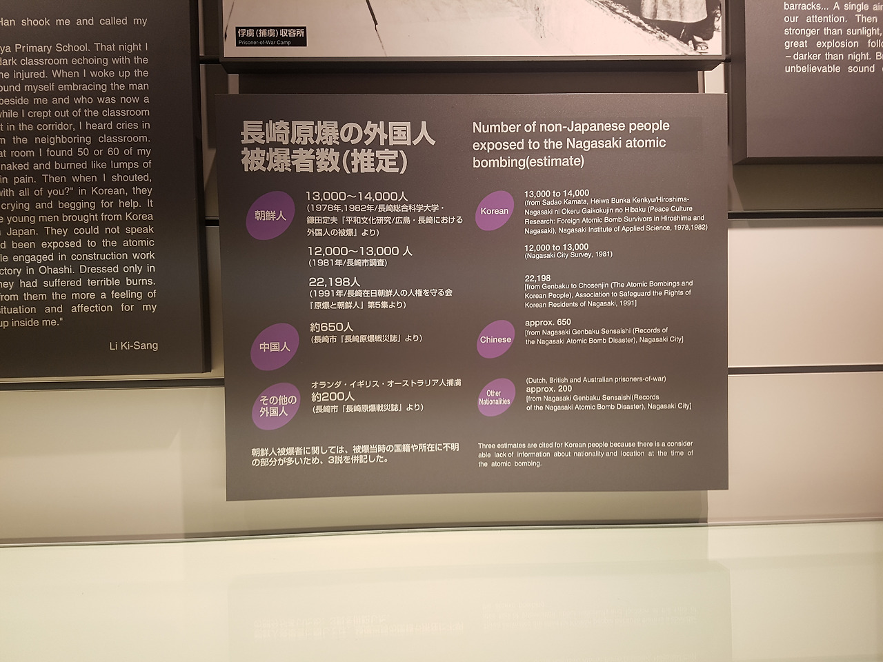 중국인은 650명, 이외의 외국인들은 200명 정도라고 한다. 일제강점기 시대 때 나가사키에서 일을 했던 많은 한국인들이 원폭으로 인해서 희생당했다.