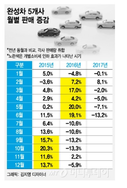 머니투데이가 게재한 2017년 7월 15일 가라앉는 車내수… 개소세 재개 기다리는 車업계라는 기사 내용에 따르면