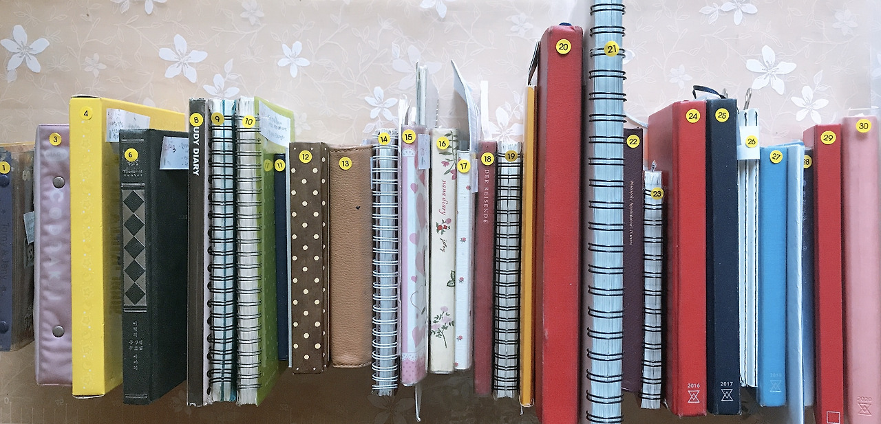 이불 킥 할 만한 내용만 가득해서 오글거림을 참기 위해 눈을 질끈 감고 빠르게 종이를 휘리릭! 넘기는 순간, 공부하는 동안 스스로를 다그치느라 가혹한 채찍만 쓴 일기 때문에 다음장을 넘겨보기 무서운 순간, 때로는 빈 공간이 난무한 공간을 넘기며 이때는 왜 기록을 하지 않았지? 하는 의문스러운 순간을 손으로 집어가며 "애썼다."라고 말해본다.