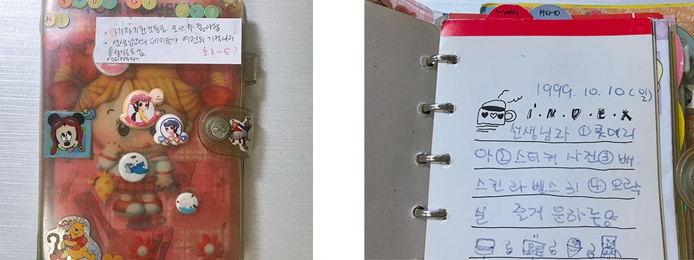 하지만 쓰고 싶은 마음과 쓰는 행위는 같은 게 아니었다. 일기를 쓰기 위해 다이어리를 샀지만 예쁜 스티커를 사모아서 수집해 두거나, Mr.K잡지에서 부록처럼 제공하던 6공 다이어리 속지를 가위로 오려 차곡차곡 모아두는 곳으로 바뀌는 등 내 얘기가 없는 일기가 되기도 했다. 다이어리를 새로 선물 받거나 노트를 새로 사면 내 일기장을 3개나 바꿔가며 여기 찔끔, 저기 찔끔 쓰는 일기가 모아지기도 했다. 주객이 전도된 일기 생활(?) 속에서도 책상에 앉아 슥삭슥삭 무언가를 썼던 덕분에, 화려한 속지 위에는 소박한 나의 일상과 감정이 적혀있다. 11살의 나는 미술 선생님과 시내에서 밥 먹고 스티커 사진을 찍는 데이트로 행복한 하루를 보냈었는데, 기록이 없었다면 기억하지 못했을 것이다.