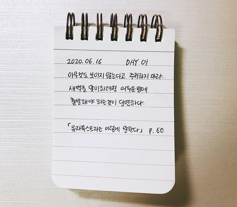 나는 큰 방향을 새로 잡아야 했고, 눈뜨면 내 발을 디딜 현실을 만들어야 했다. 그러기 위해서는 "나는 누구인가?"라는 질문에 대답을 할 수 있어야 하는데, 자꾸 직업적인 명칭으로만 나를 네이밍 했다. 정말 간절하게 대답을 찾고 싶었으나 명확한 말들이 나오지 않았다. 오아시스가 없는 사막을 걷는 기분이었다. 그때, 불현듯 하나의 책이 생각났고 나는「차라투스트라는 이렇게 말했다」를 손에 잡게 되었다. 나는 나를 다시 세우기 위해, 우상에 대한 이야기가 아닌 '실존'의 얘기를 들려주는 철학을 찾았다.