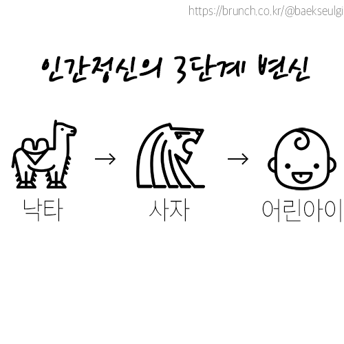 낙타는 등에 많은 짐을 짊어지고 앞으로 걸어간다. 무릎은 굳은살로 덮여있고 왜 짐을 짊어지고 사는지 의심하지도 않는다. 그저 건조하고 뜨거운 사막을 걸어갈 뿐이다. 낡은 생각이나 의미 없는 일을 여과 없이 받아들이며 인내심 하나로 살아가는 삶이다. 수동적으로 살던 낙타가 자유를 갈망하기 시작하니 사자의 모습으로 바뀐다. 사자는 많은 짐을 거절할 자유를 쟁취했지만 스스로가 무엇을 위해서, 왜 존재하는지 모르는 상태이다. 사자는 거칠고 전투적이다. 사자가 자신의 존재를 인정하고 삶을 사랑하기 시작하자 어린아이로 변신힌다. 어린아이는 모든 것에 천진난만하여 세상을 재미있는 놀이로 다루는 자이다.