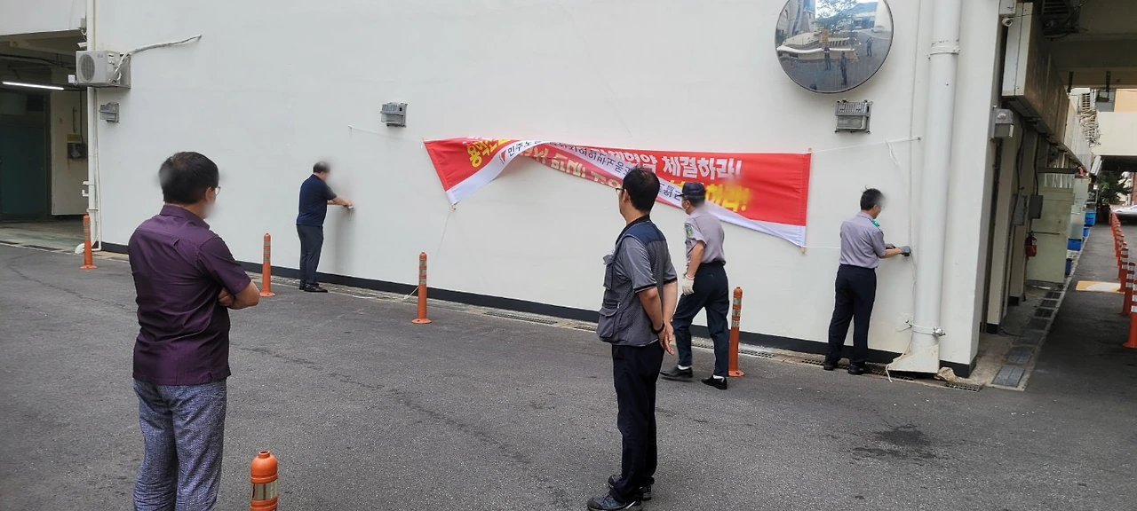 이런 사측과 대화가 잘 통할 리가 없다. 조합원들은 쟁의행위 찬반투표를 전원 가결로 통과시키고 작년에 쟁의행위에 들어갔다. 핵심 요구안은 용역전환 반대와 단체협약 체결이었다. 상가 건물 곳곳에 투쟁 현수막을 부착했다. 하지만 사측은 시설관리권을 운운하며 노조 현수막을 붙이는 족족 제거했다. 끈질기게 쉽게 제거하기 힘든 외벽현수막을 설치하기도 했지만 소용없었다.