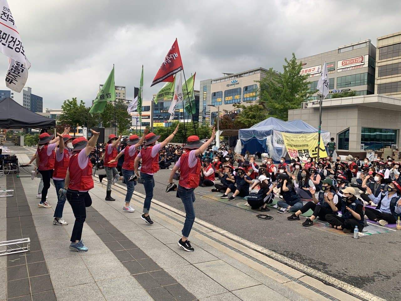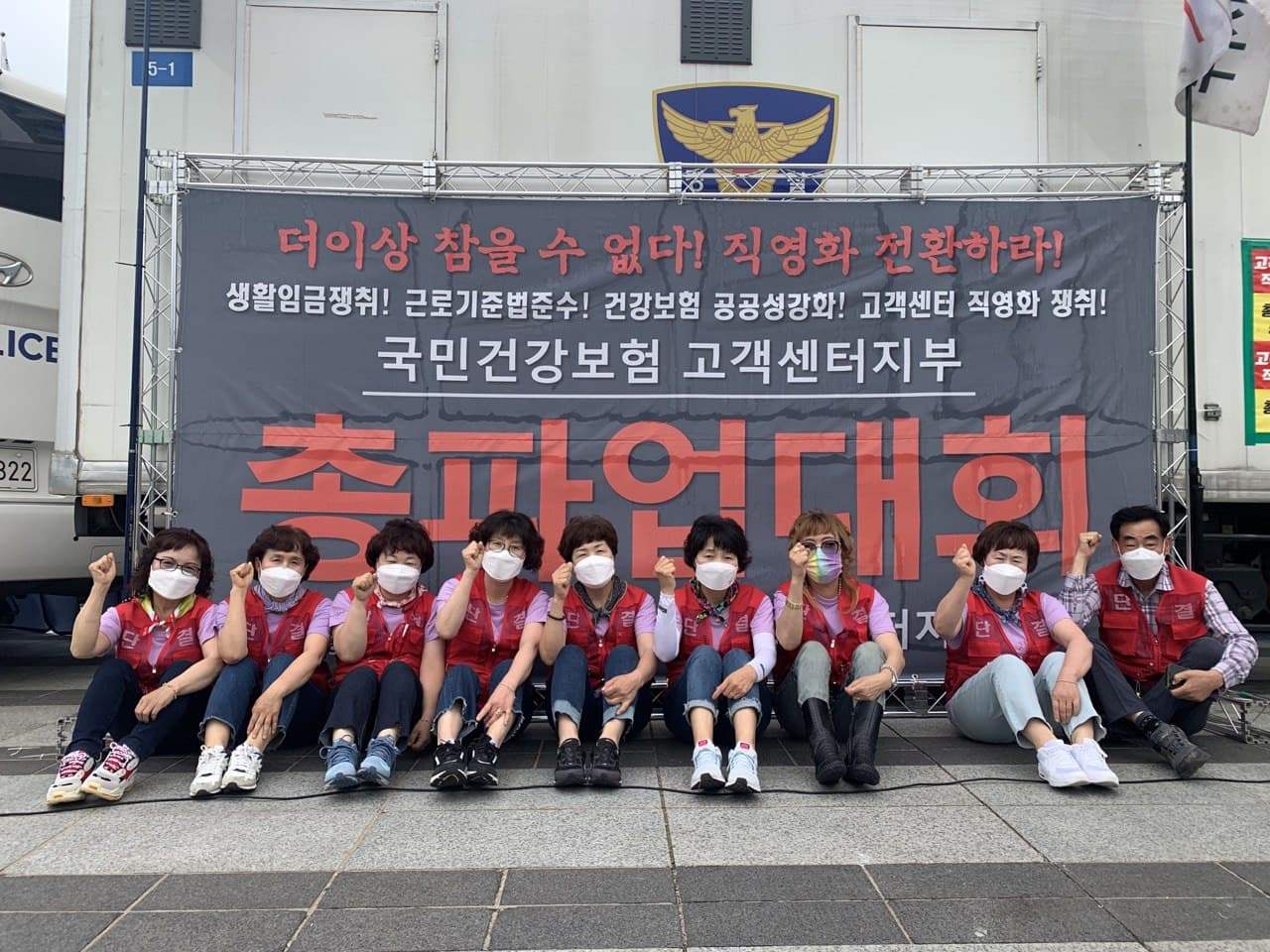 신라대 청소노동자는 농성장을 정리하고 다음날 6월 18일 국민건강보험공단 고객센터 비정규직 투쟁 현장을 찾았다고객센터 비정규직 노동자는 ‘고객센터 직영화, 건강보험 공공성 강화, 생활임금 보장’ 위해 투쟁 중이었다. 장기 농성으로 쌓인 피로를 풀 틈도 없이 비정규직 투쟁 현장으로 향했다.