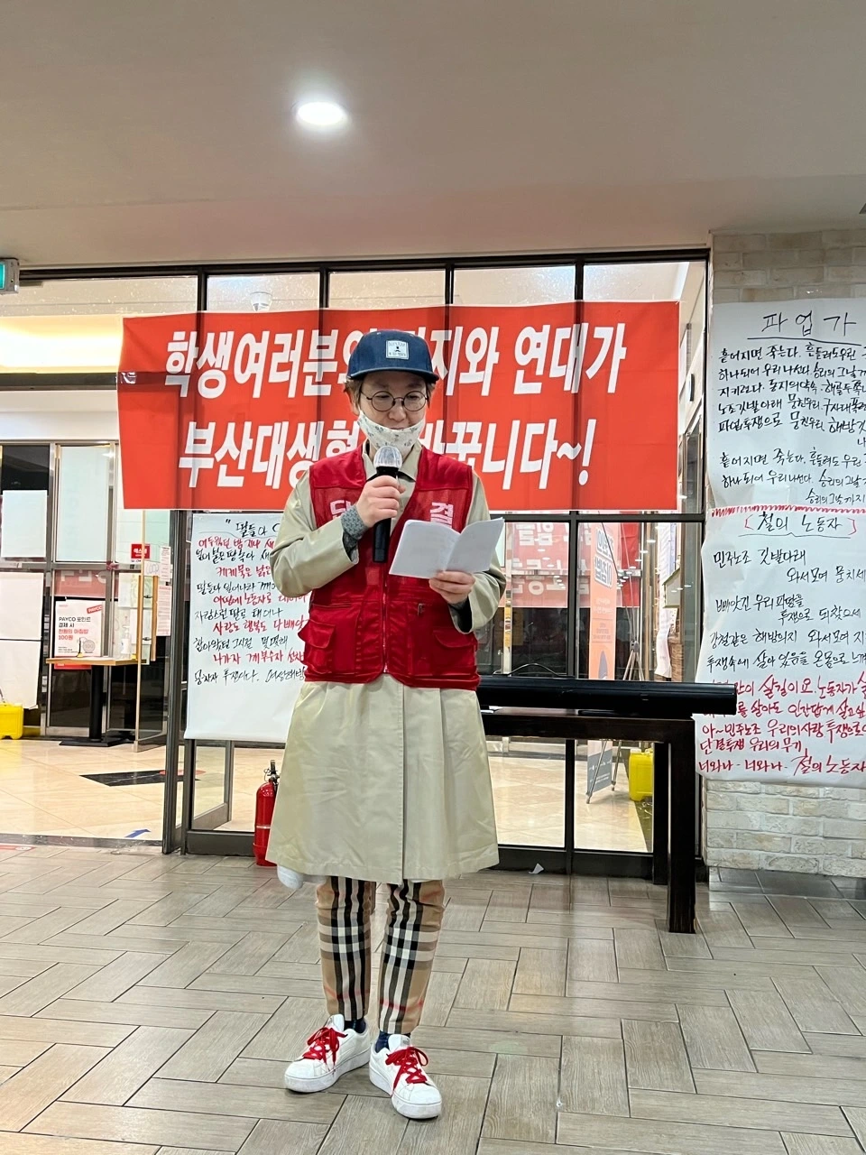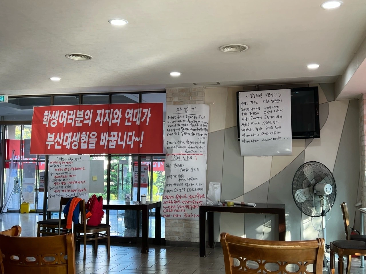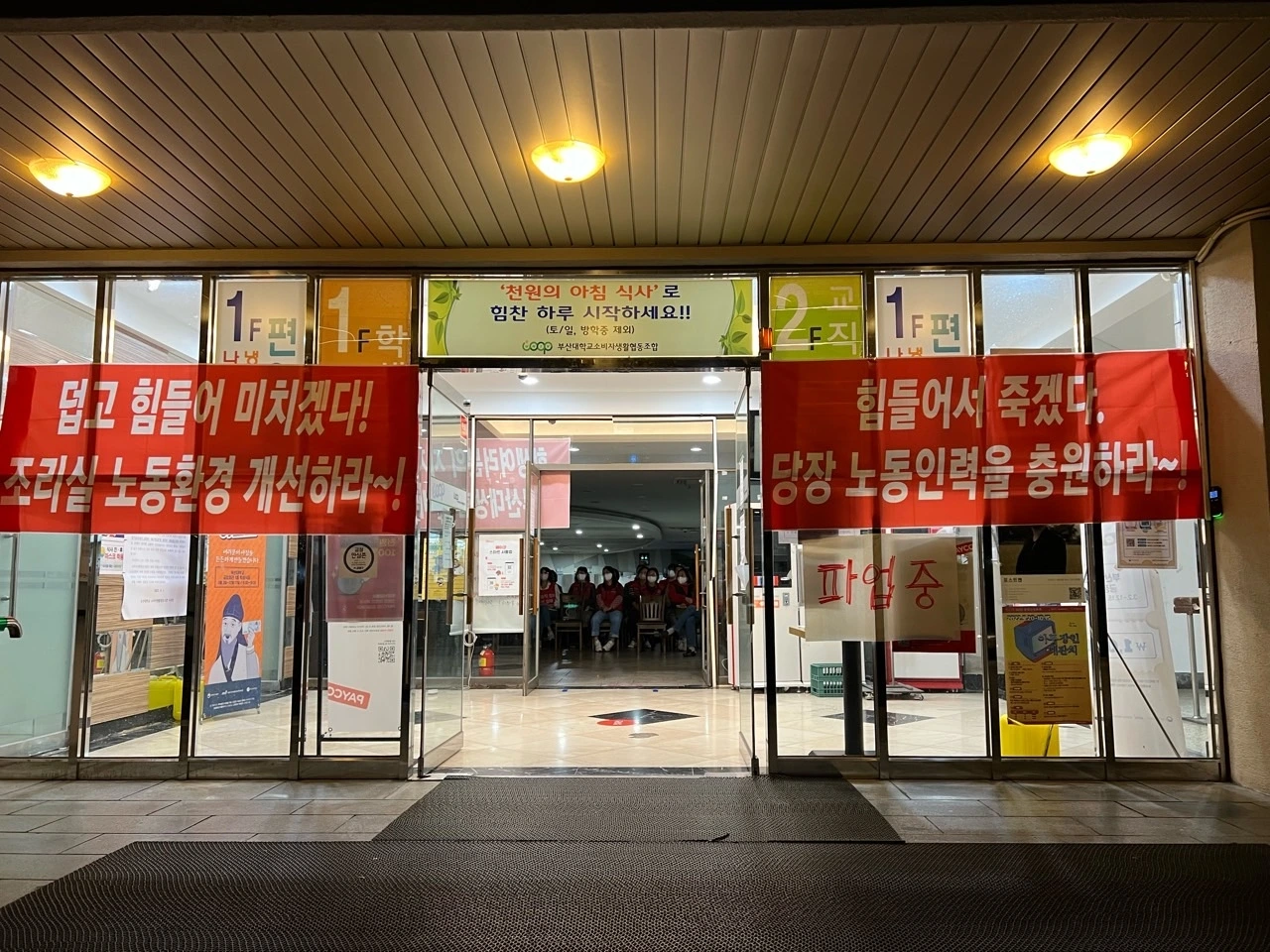 부산대 생협 노동자들이 어제 파업을 시작했다. 다른 업무가 있어 현장에 늦게 도착했는데 조합원들이 대뜸 단결투쟁 문구가 박힌 머리띠를 달라고 하셨다.