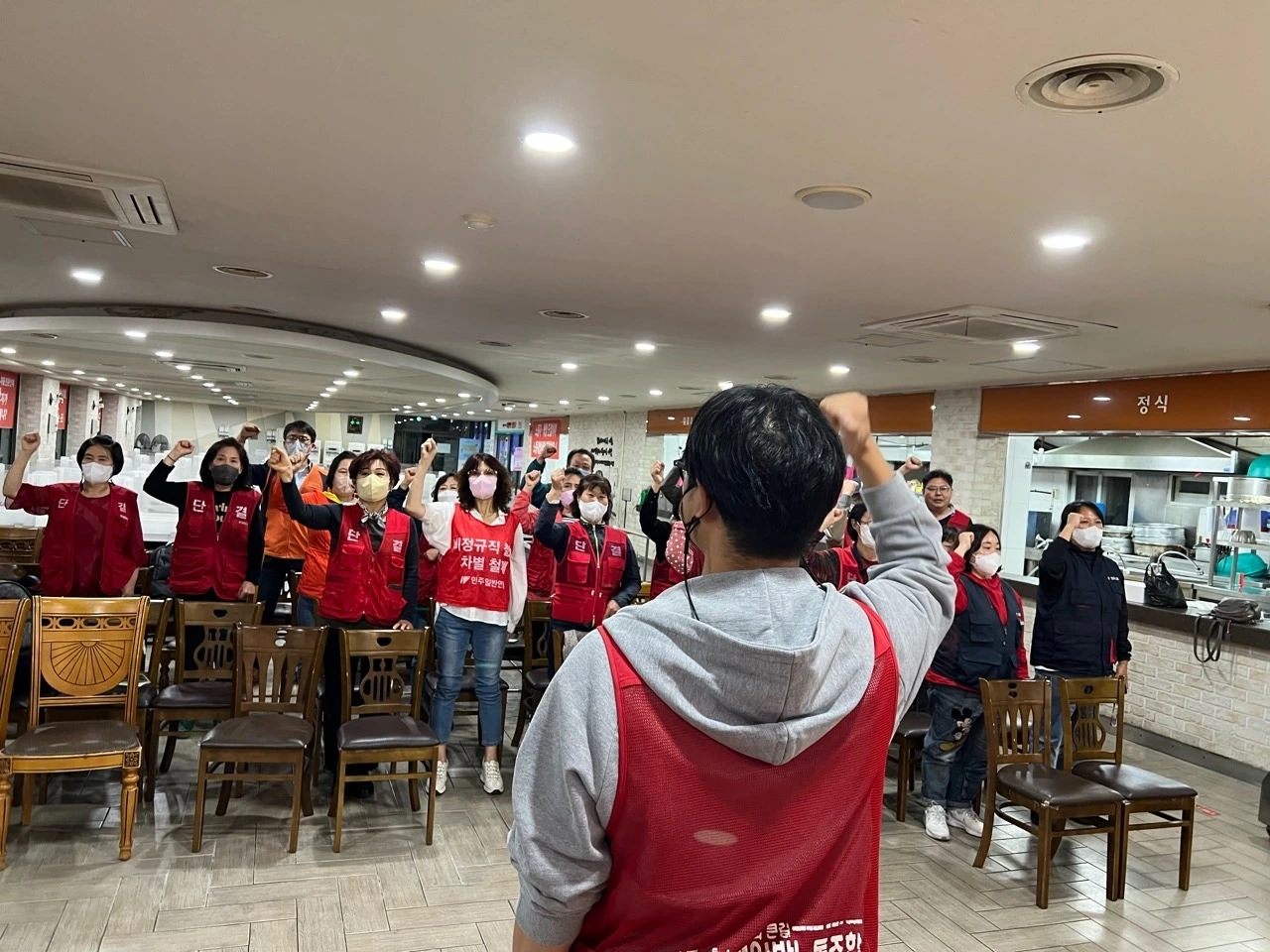 더 단결하여 싸울 수 있는 방안 중에 패션 센스도 놓치지 않고 있다. 붉은 조끼 입었으면 단결투쟁 머리끈도 메야한다는 게 조합원 생각이다.