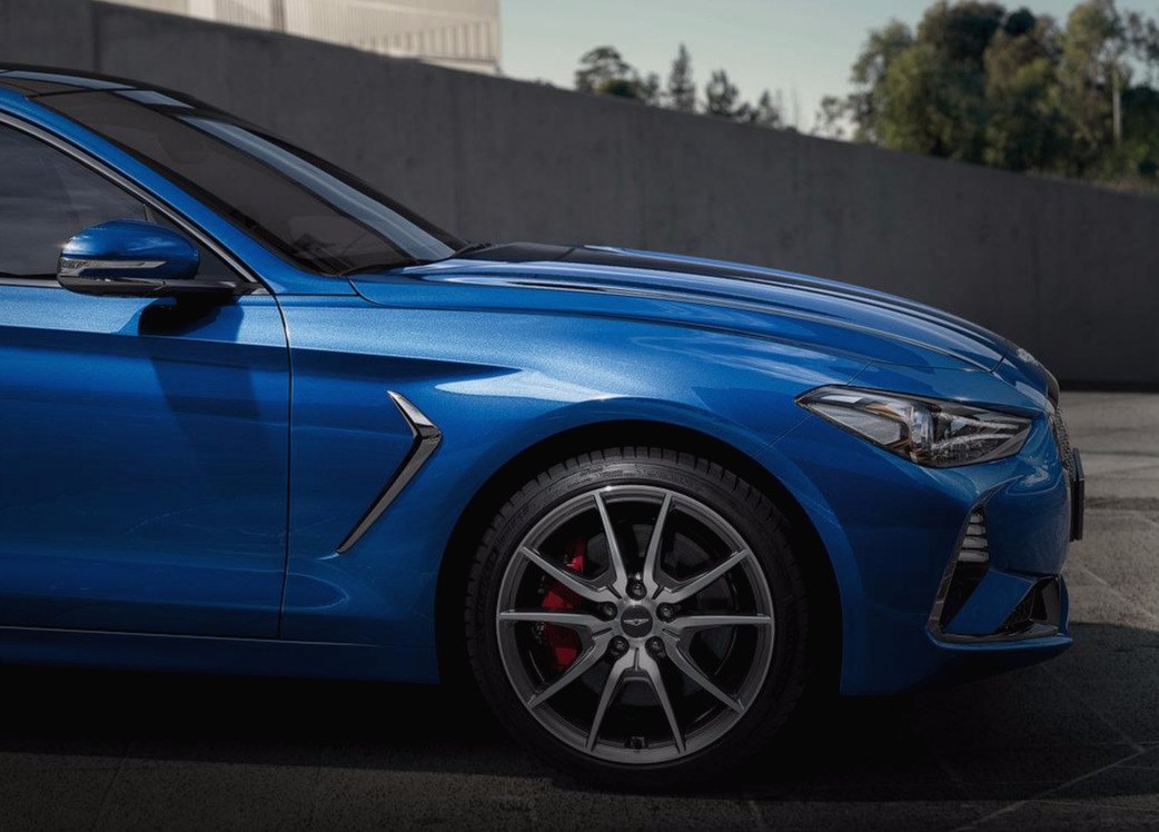 전체적인 앞부분 디자인은 팽팽한 면들로 구성되어 군살 없는 몸처럼 다부져 보인다. EQ900과도 약간 비슷한데 더 역동적이다. 후드 라인은 제네시스 뉴욕 컨셉에서 이어진 모습이다. 전폭은 D세그먼트 세단 중 가장 넓다는데, 그래서인지 낮게 깔린 듯한 차체가 보기 좋다. 위의 메탈릭한 그레이 색상보단 좀 더 채도가 있는 색상에서 차체 볼륨이 더욱 살아 보이는 듯하다. 이번 G70은 차체 색상이 10가지로 예전보다 다양해지고 도장 퀄리티 또한 높아졌다. 특히 왼쪽의 '블레이징 레드' 색상은 베이스 코트를 두 번 뿌리는 도장 방식을 사용하여 더욱 채도 높고 고급스러운 색상을 낸다고 한다.