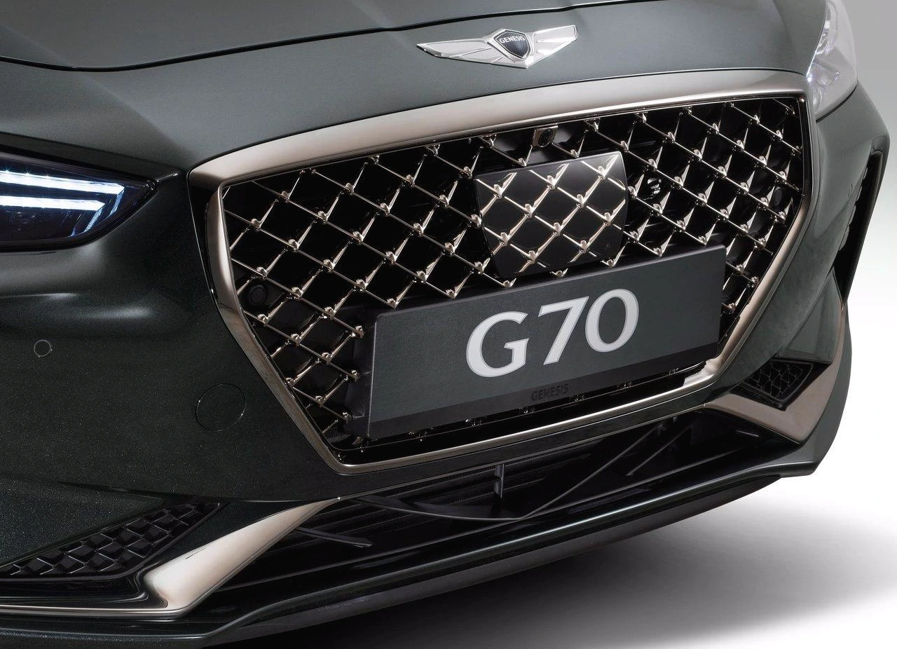 첫인상은 스포티하다. 제네시스가 자사 디자인 아이덴티티로 제시한 것이 '역동적인 우아함(Athletic Elegance)'인데, G70은 지금까지의 제네시스 차 중 가장 역동(Athletic) 쪽으로 치우친 느낌이다. 기존 제네시스 차들과 어느 정도 패밀리룩을 유지하면서도 새로운 디자인이다. 헤드램프는 그간의 난잡하던 모습을 어느 정도 벗어던지고 두 줄의 LED DRL 시그니쳐로 방향성을 잡았다. 이는 GV80 컨셉의 LED 헤드램프에서 따 온 것이다. 앞으로도 모든 제네시스 차종에 적용될 아이덴티티라고 한다. 크레스트 그릴의 모양새는 G80이나 G90에서 크게 변형된 형태는 아니어서 조금 아쉽다. 크레스트 그릴 자체가 현대차 아이덴티티로 삼고 있는 헥사고날 그릴(현재 캐스케이딩 그릴)과 너무 비슷하게 생겨 차별화가 부족하다. 아직 제네시스 브랜드만의 아이덴티티가 부족하다는 인상이다. 이상엽 디자이너에 따르면 제네시스의 그릴은 앞으로 더 낮아지고 넓어지며 현대차 그릴과는 차별화될 것이라고 하는데, 앞으로를 기대해봐야 할 듯하다. 그릴 안쪽은 기존의 수평 리브가 아닌 GV80 컨셉과 비슷한 메쉬 타입의 격자 리브를 적용해 엄격한 느낌을 조금 벗어던졌다. 그런데 프론트 인상의 전체 비례를 볼 때 그릴이 지나치게 큰 것 아닌가 하는 생각이 든다. 면적이 넓은 크롬으로 마감되어 있어 그런 건지, 새로운 스포티한 디자인에 눈이 아직 덜 익은 건지 그릴이 혼자 튀어 보인다.