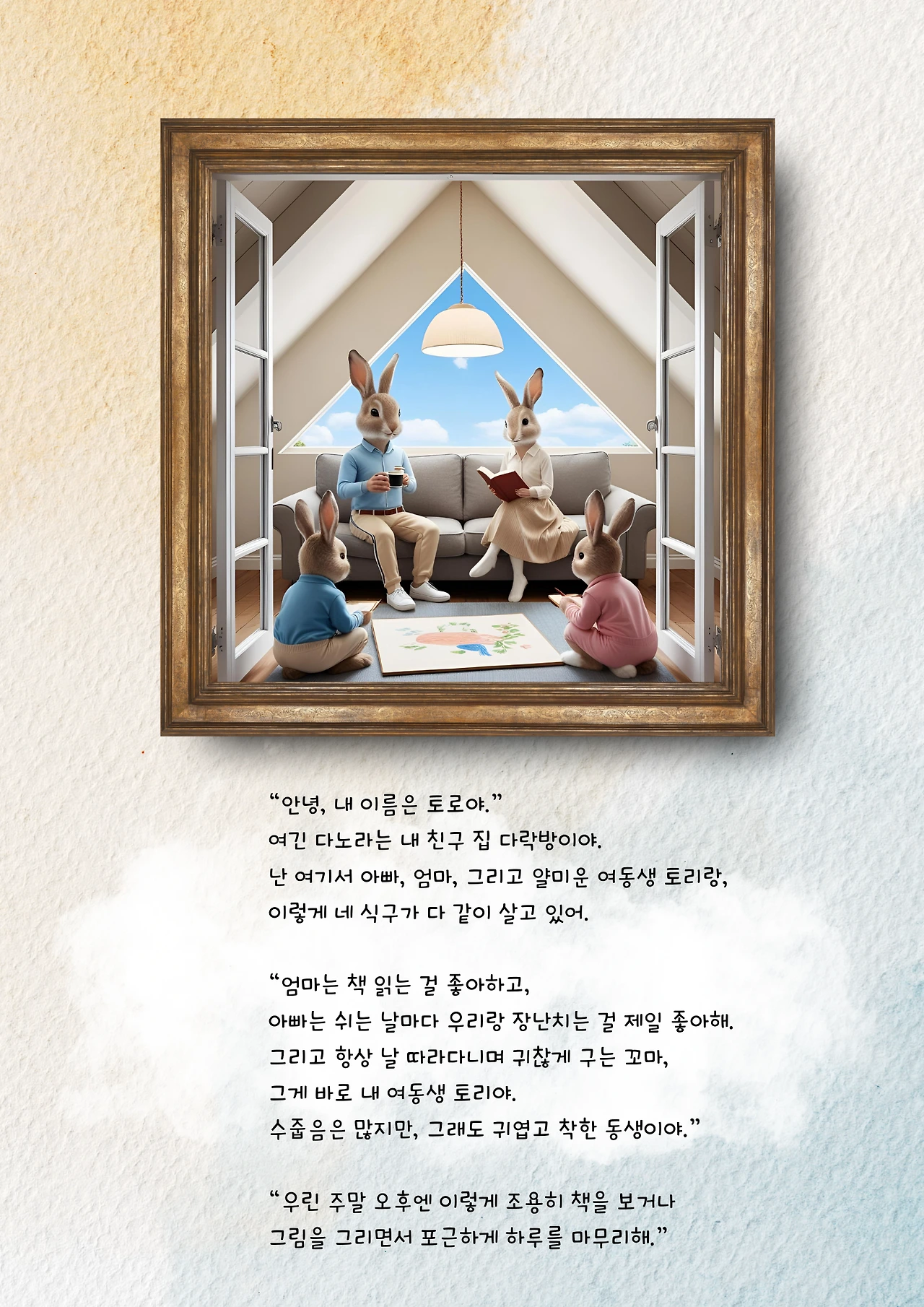 사람이 사는 집, 다락방 한 켠 낡은 이불 위에서 가족과 함께 사는 작은 토끼 남매, 토로와 토리가 살고 있었어요.
