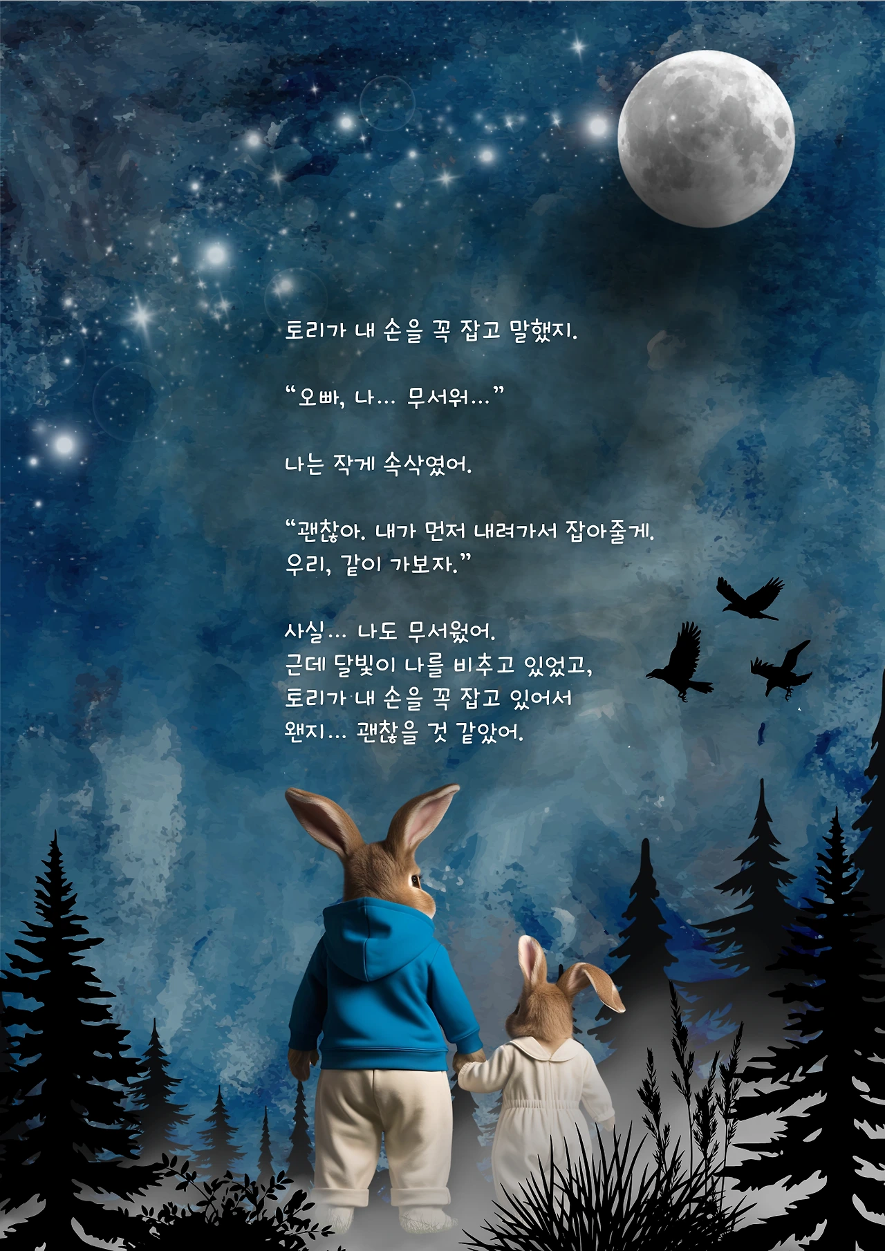 “토리야, 하늘 좀 봐.” 토로가 손가락으로 가리킨 밤하늘엔 수많은 별들과 환한 달님이 반짝이고 있었어요. 마치 두 남매의 길을 밝혀주듯 조용히 따라오고 있었답니다.