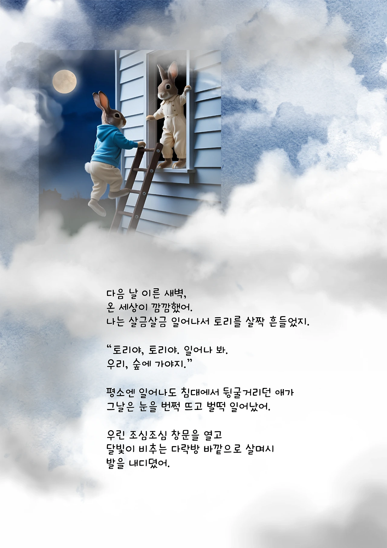 다음 날 새벽, 토로는 토리를 몰래 깨워 조용히 다락방 창문 밖으로 나왔어요. 별빛이 아직 머물러 있는 어두운 하늘 아래, 토리는 무서운 듯 형의 손을 꼭 붙잡았지요.