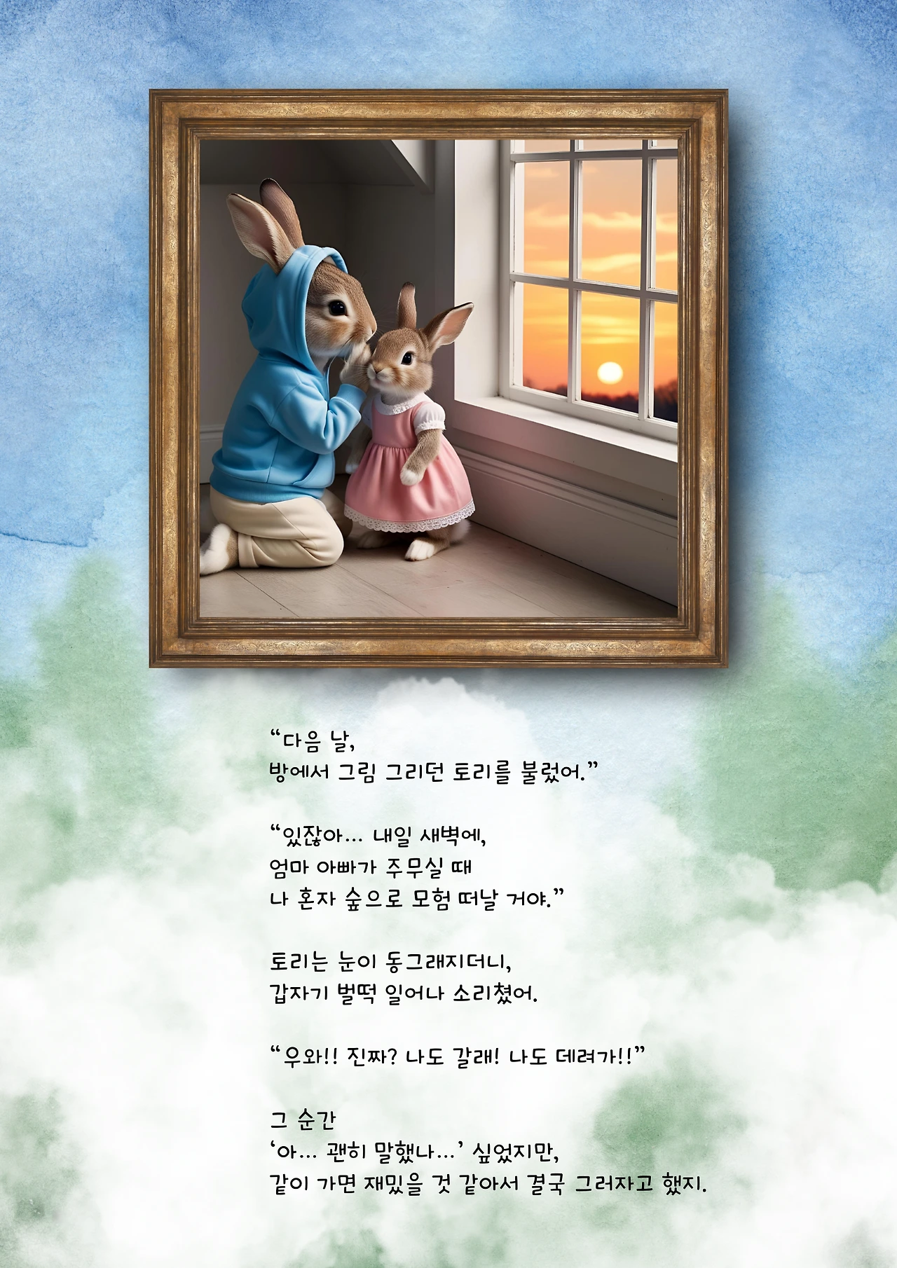 며칠 뒤, 토로는 동생 토리에게 속삭였어요. “내일 이른 새벽, 엄마 아빠가 주무실 때 숲으로 모험을 떠날 거야.” 걱정이 앞선 토리는 망설이다가 결국 말했어요. “그럼 나도 같이 갈래!”