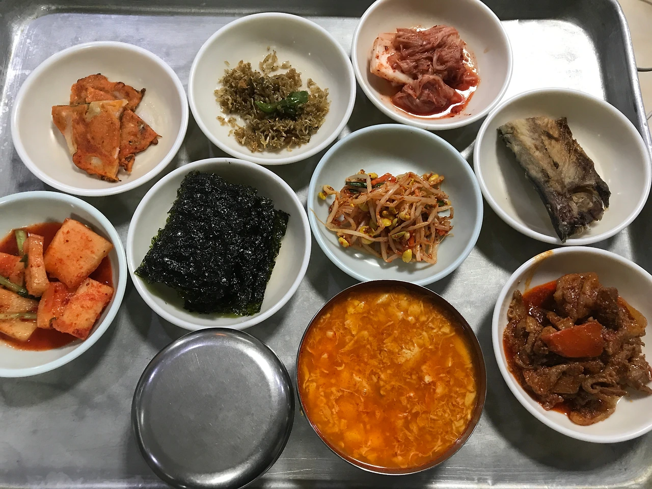 '한공기의 밥으론 안되는 어마어마한 반찬들이라니.. 밥한공기 더 사먹게 하려는 사장님의 큰그림이었을까?'