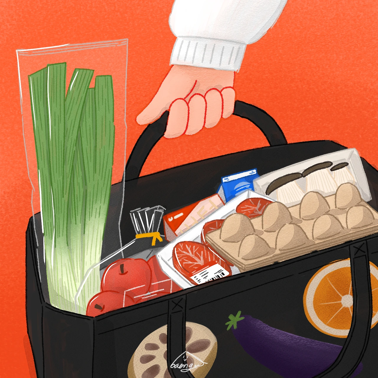 그래서 이번 주제인 ‘장바구니’를 보자마자 사고 싶었던 모든 것들을 한번 담아봤어요. 고기도 구워 먹고 과일도 먹고 우유도 한가득 마셔보고요. 꽉꽉 담긴 장바구니를 들면 묵직-한 게 힘이 꽤 많이 들지만은 집에서 맛있는 것들을 해먹을 생각에 신이 나기도 한답니다.
