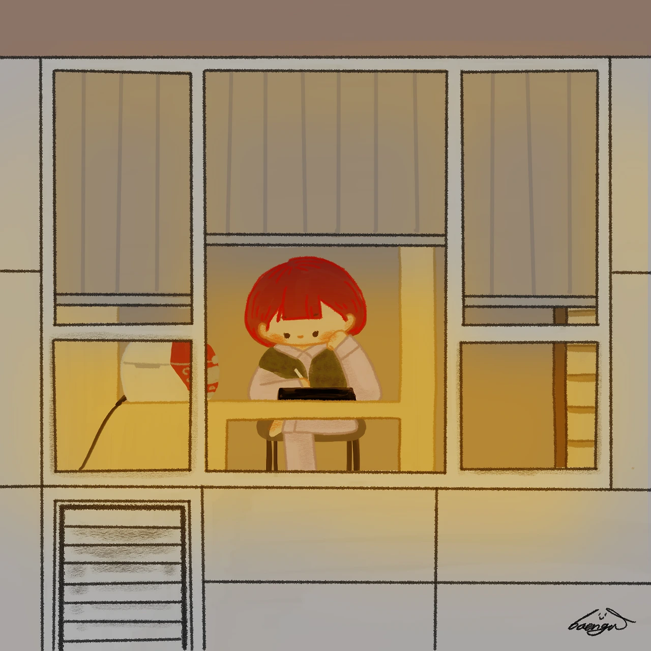 이런 제가 그림을 그리는 동안, 저희집 창 밖에서 저는 어떻게 보일까 궁금해졌어요. 지금 잠깐 집을 얻어 지내고 있는데, 창문 블라인드를 걷으면 집이 전부 다 보이거든요. 상상을 조금 보태서, 주황빛 조명을 켜고 그림에 집중하는 저를 그려보았습니다. 책상겸 밥상겸 조리대에서 밥솥 옆에서요. ㅎㅎ 언젠가 이것도 추억이 되겠지요-!