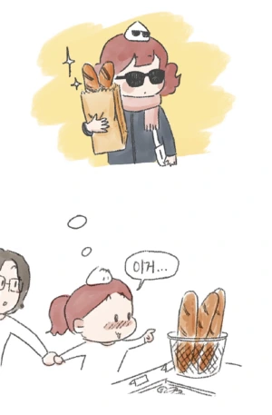 집에 도착해서 호다닥 손을 씻고 바게트를 한 조각 꺼내 한입 베어 물었는데. 그것은 내가 생각한 느낌의 맛이 아니었다. 어딘지 모르게 바삭함이 사라진 바게트 껍질과 왜인지 푸석하고 질겼던 바게트 속. 그게 내 첫 바게트였다. 아니 이럴 수가 있나? 어째서?? 그럼 외국 사람들은 전부 이 맛없는 바게트를. 그렇게 맛있게 먹는 이유가 뭐지? 내가 왜 이걸 골라왔을까. 그냥 늘 먹던 대로 소세지빵을 고를걸. 끝도 없는 후회와 실망만이 나의 첫 바게트 기억을 만들었다. 그 이후로는 빵집에 가면 바게트는 쳐다도 안보는 지경에까지 이르렀고, 바게트를 안고 다니는 장면이나 이미지를 볼 때마다 그건 그저 보이는 게 다라고 생각했다.