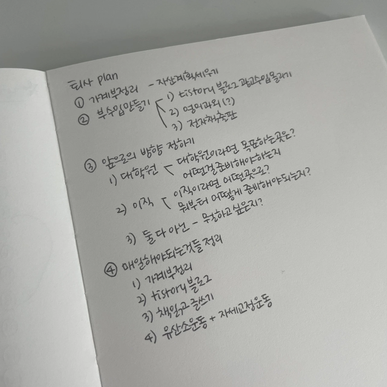 2번. 부수입 만들기. 퇴사하기 전부터 부수입을 만들어야겠다는 생각을 계속해왔다. 생각만 계속했지 뭐 하나 제대로 진행된 것이 없어 아쉽지만 지금부터는 부수입에 대한 것들을 많이 생각해야 한다. 지금 내가 할 수 있는 것은 한 달에 만원 정도 간신히 벌리고 있는 수익형 블로그를 조금 더 키워보는 것, 영어를 계속해왔으니까 영어 과외를 하는 것, 써보자고 마음먹고 있는 전자책 하나를 잘 마무리해서 출판해보는 것. 이 정도가 생각이 난다. 어떤 것들이 나에게 큰 수익을 줄지는 모르겠지만 일단 뭐부터 시작해야 되는지 적어보니까 시각화가 된다.