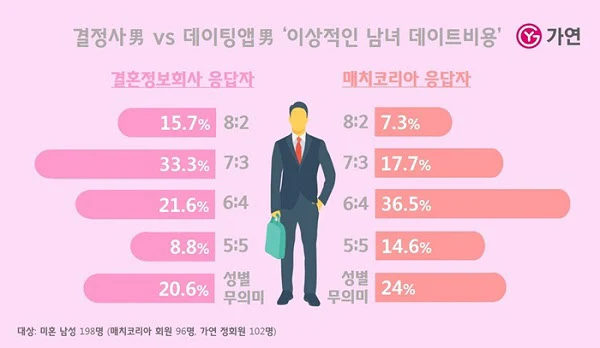 결혼정보회사 ‘듀오’가 지난해 2030 세대 미혼남녀 422명을 대상으로 실시한 ‘데이트 비용 관련 설문조사’에 따르면 ‘데이트 비용으로 연인과 다툰 적이 있다’는 사람이 전체의 83.2%를 차지했다. 그들은 연인과 다툰 이유로 ‘내가 데이트 비용을 더 내는 것을 당연시 여겨서’(35.8%)와 ‘데이트 비용을 아끼려고만 해서’(25.8%),’ 수입이 같지 않은데 비용을 정확히 절반씩 부담하려 해서’(18.2%)를 주로 꼽았다.-이데일리-