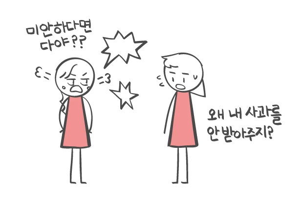 "본인은 사과를 했다고 생각하는데 저한테 미안하다는 말은 엄청 짧게 하고, 그다음에 계속 근데 이런 것도 이해 못해주냐 너무하다, 이런 말들만 반복하니까 전혀 사과처럼 느껴지지가 않는 거예요!"